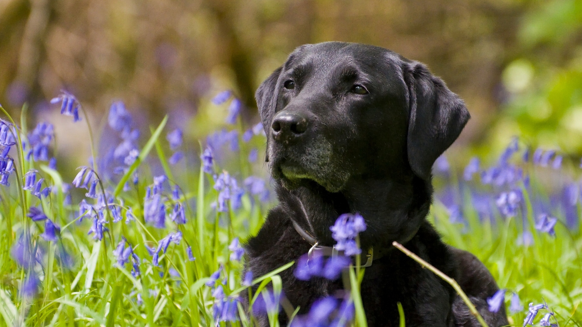 Description: A black dog laying in a field of blue flowers with its eyes closed and tongue out.