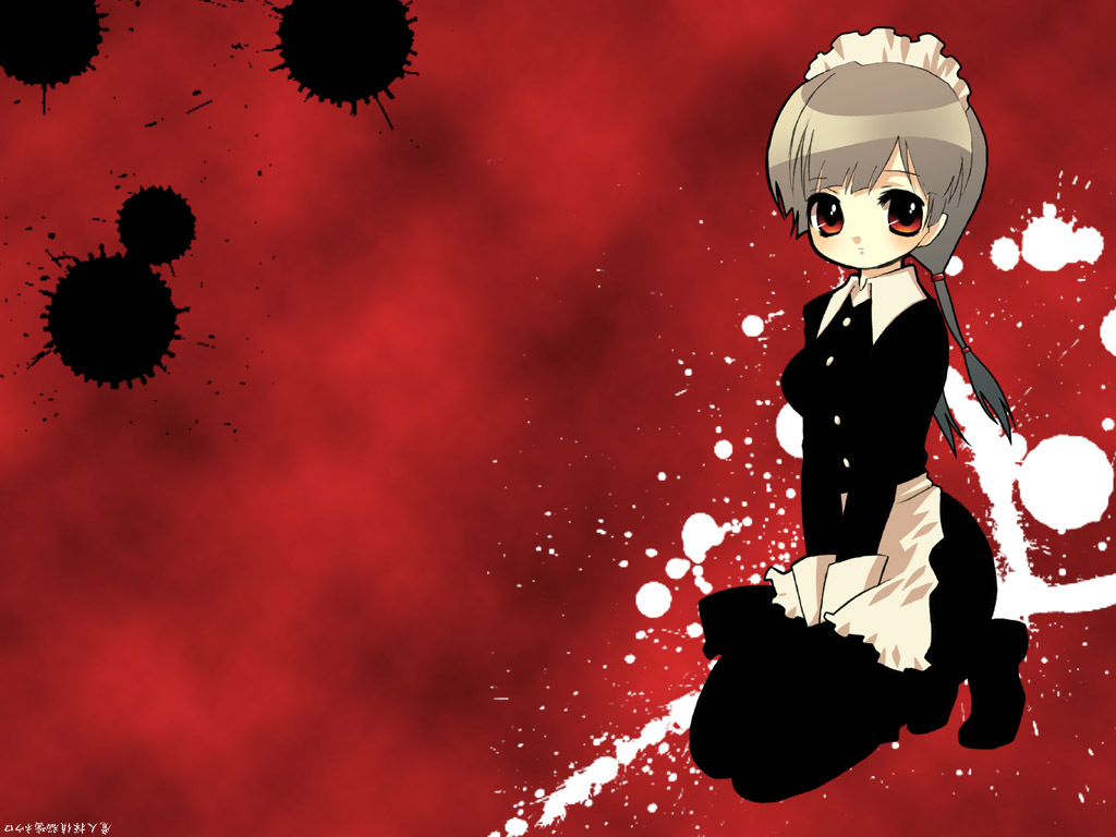 Description: A woman in a black dress and a red background with black dots and white spots on it.
