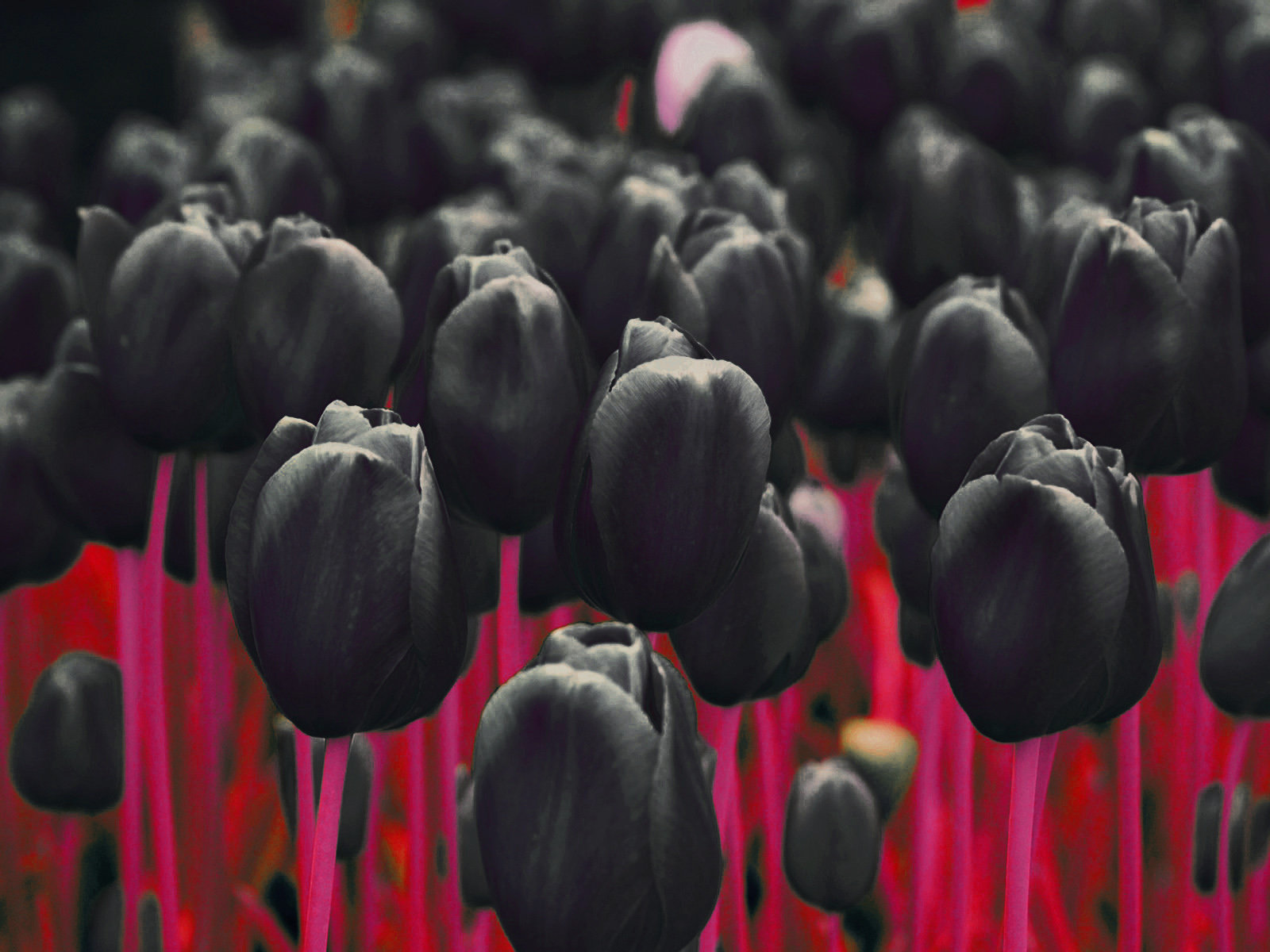 Description: A field of black flowers with red stems in the background and a red background behind them with a black and white photo of the flowers.