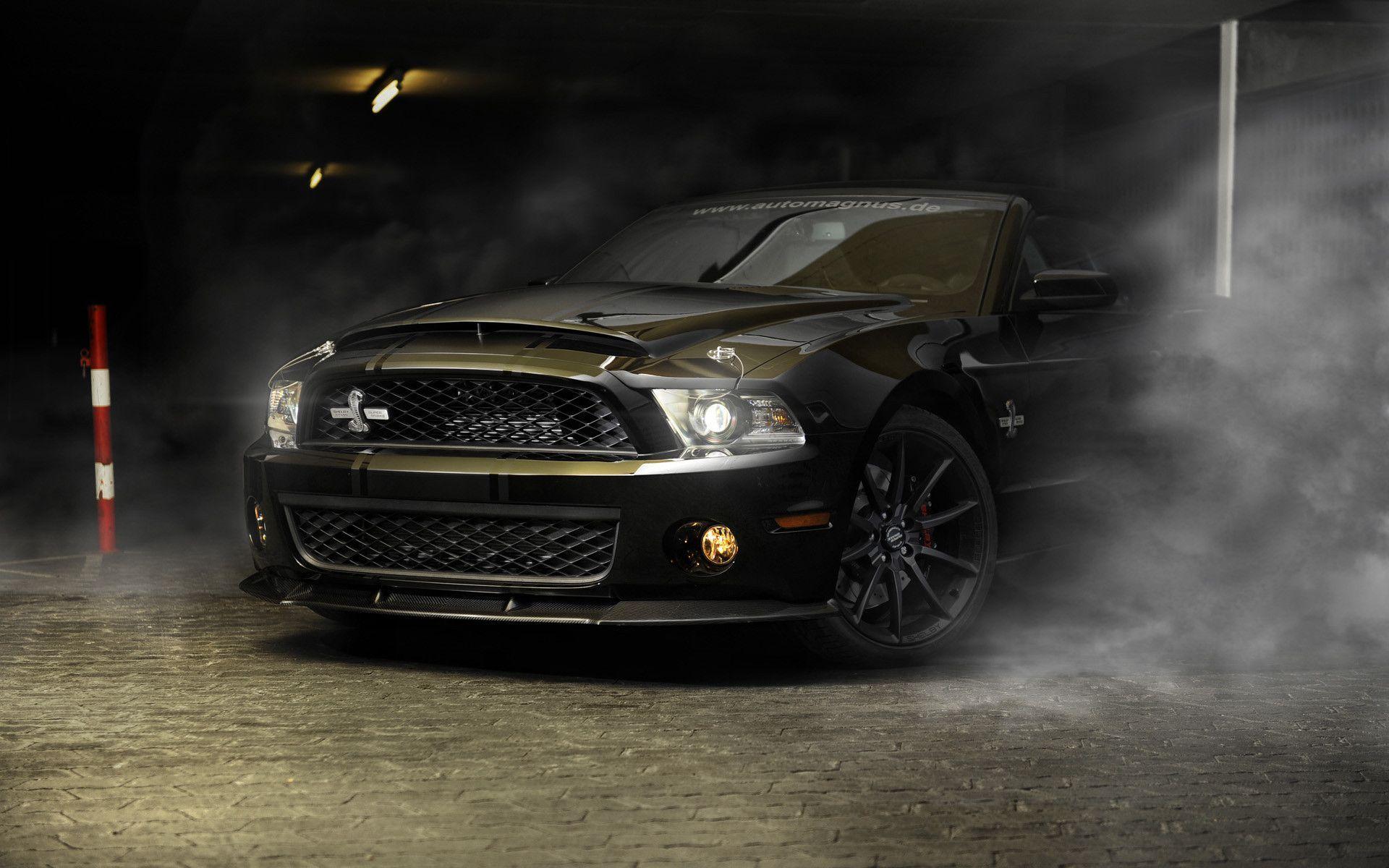 Description: A black and gold mustang in a parking garage with smoke coming out of the hood and hood vents.