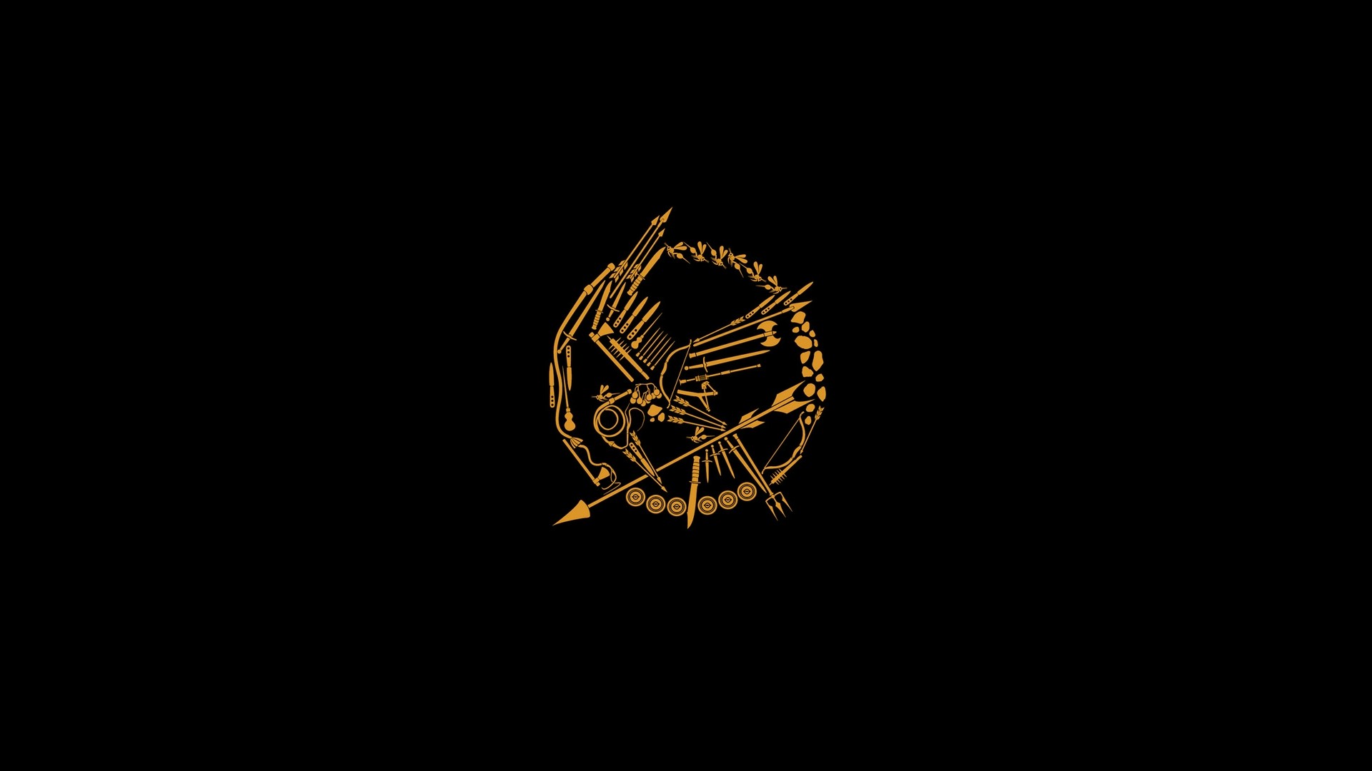 Description: A black and gold wallpaper with a gold arrow and a bow on it's side and a black background.