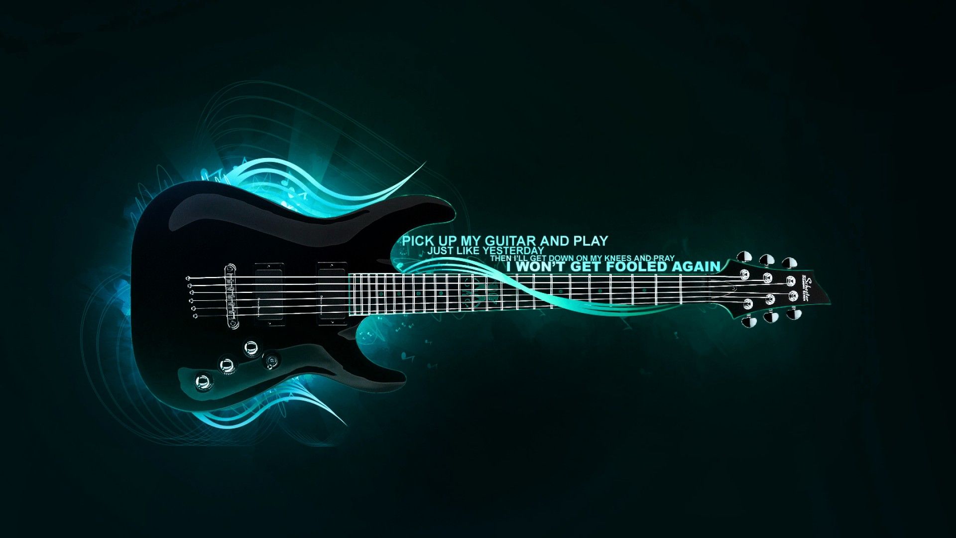 Description: A black guitar with a blue flame on it's body and a green glow on the top of it.