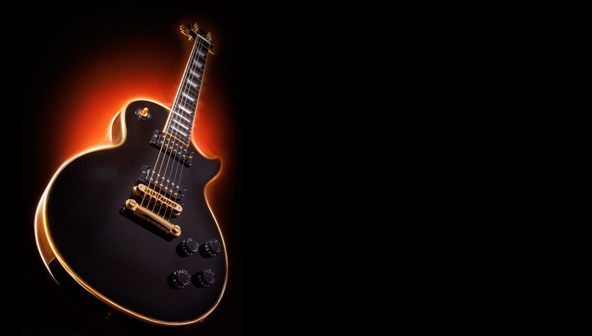 Description: A black guitar with a gold neck and neckplate on a black background with a red light behind it.