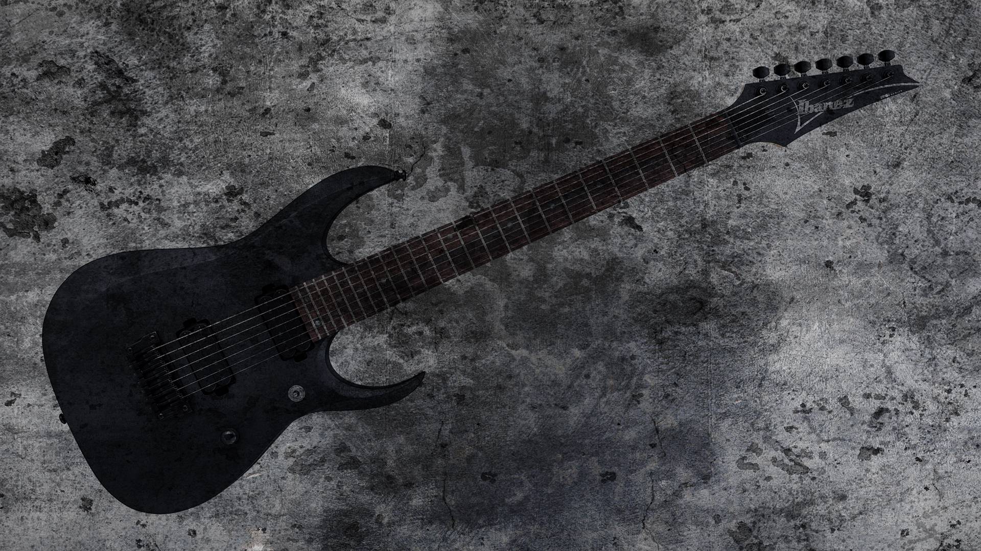 Description: A black guitar is laying on a gray surface with a black background and a black guitar pick up button.