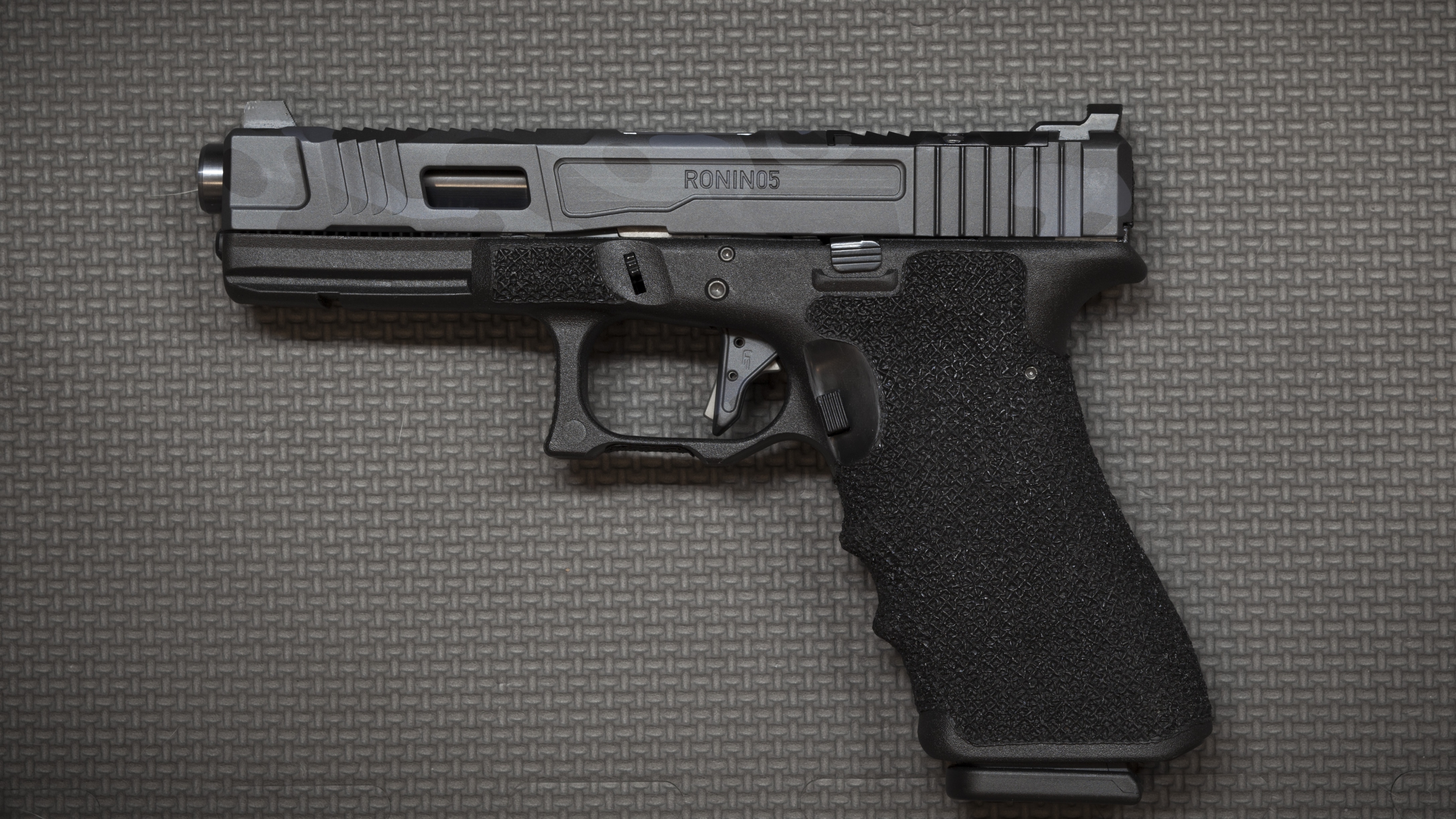 Description: A gun that is laying on a table with a black background and a black gun with a black handle.