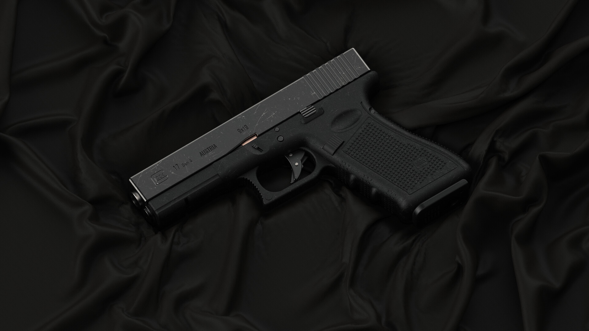 Description: A black gun laying on a black cloth with a black background that is very dark and wrinkled out with a black cloth.