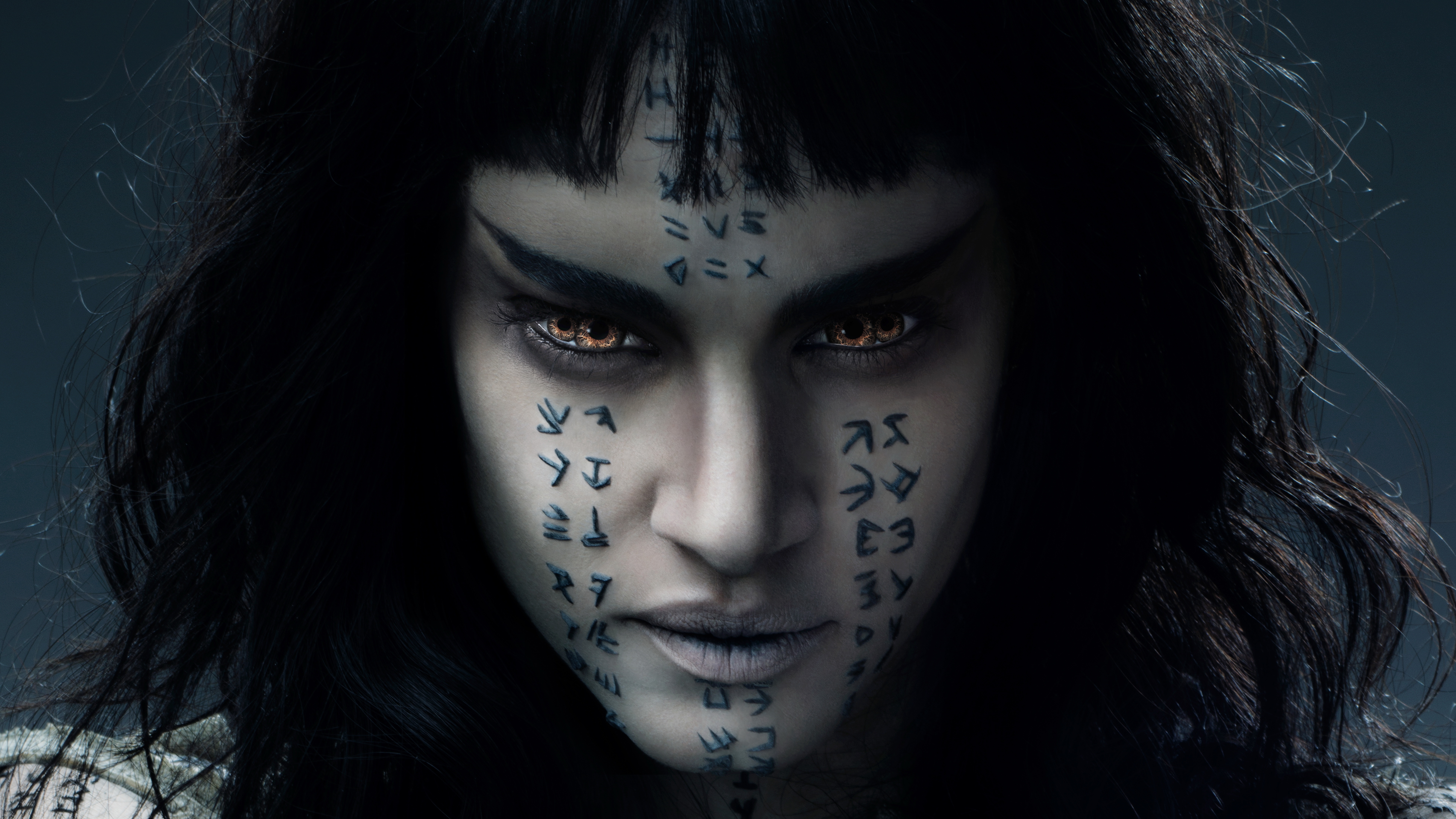 Description: A woman with black hair and makeup has letters painted on her face and eyebrows and eyebrows are drawn on her face.