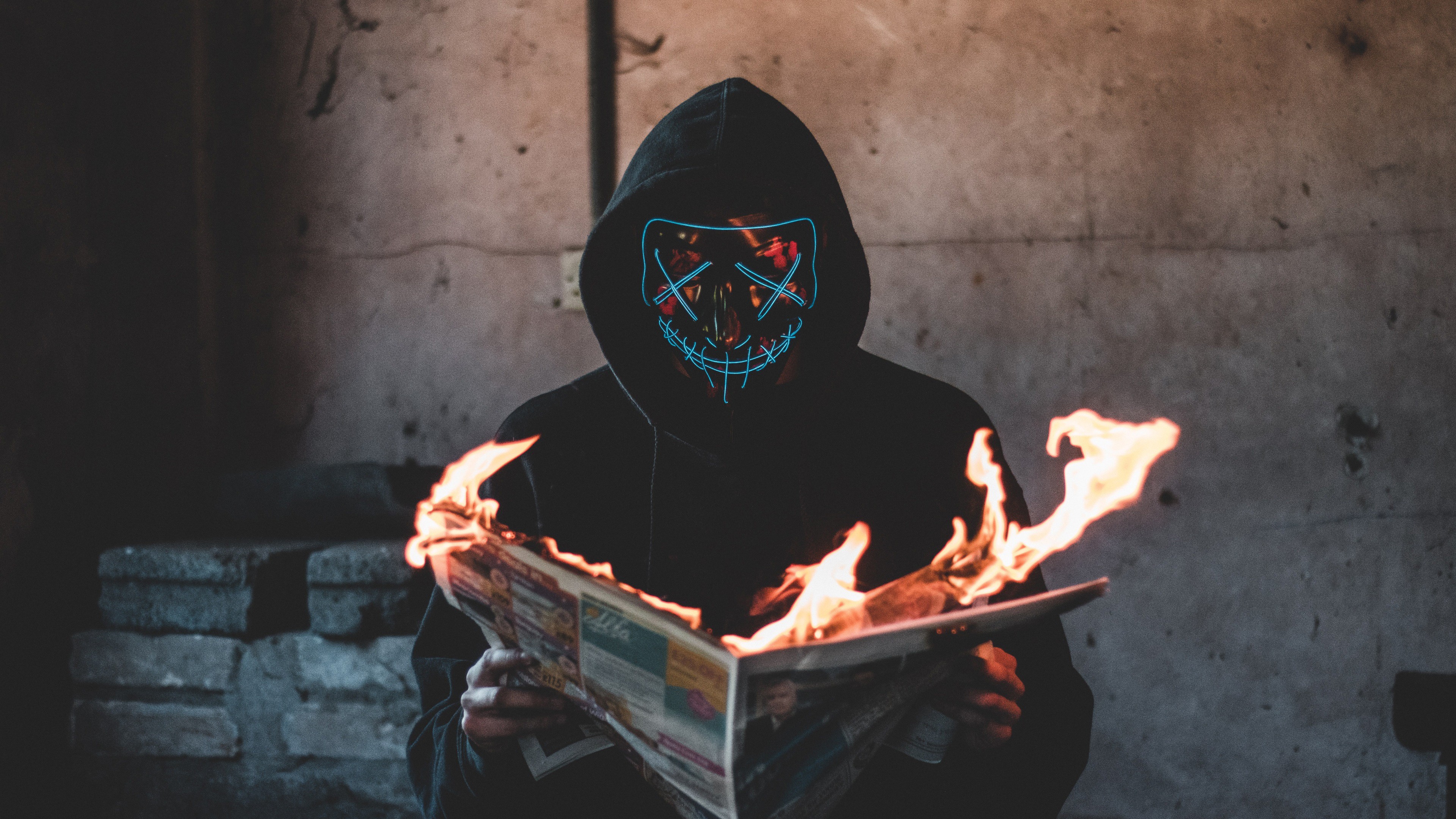 Description: A person in a black hoodie is reading a newspaper with flames in front of him and a neon mask on.