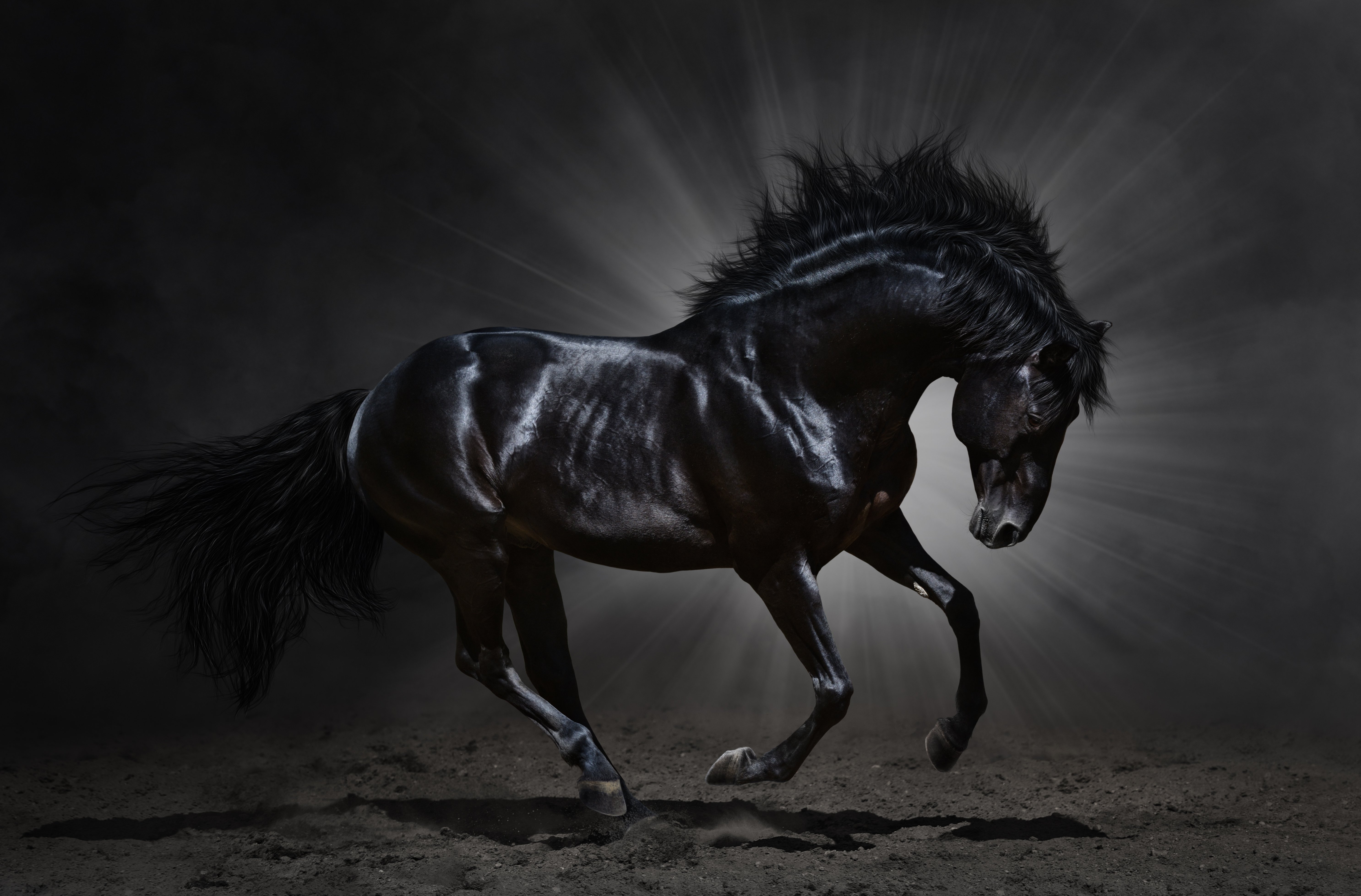 Description: A black horse running in the dark with a light shining through it's manes and tail feathers.
