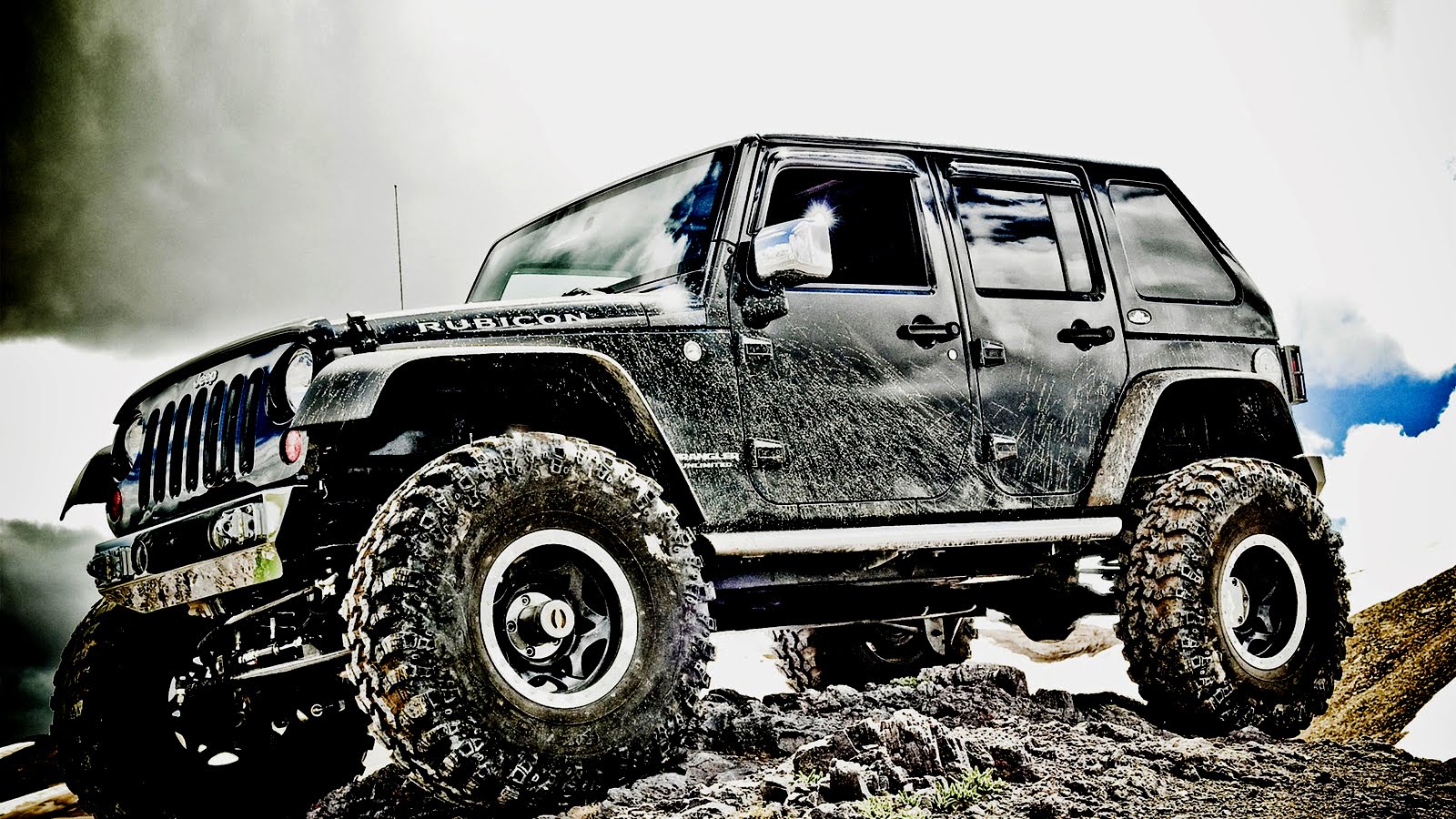 Description: A black jeep is driving on a rocky hill side with a cloudy sky in the background and a black tire.