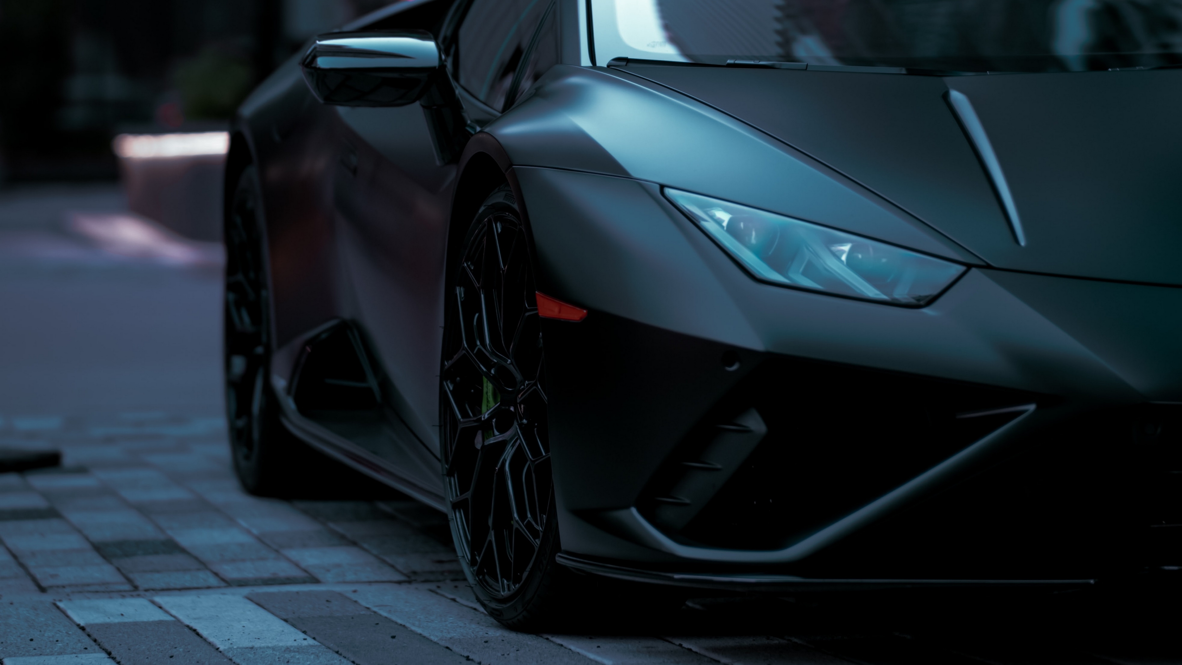 Description: A black lamb car parked on a brick road next to a building with a light on it's side.