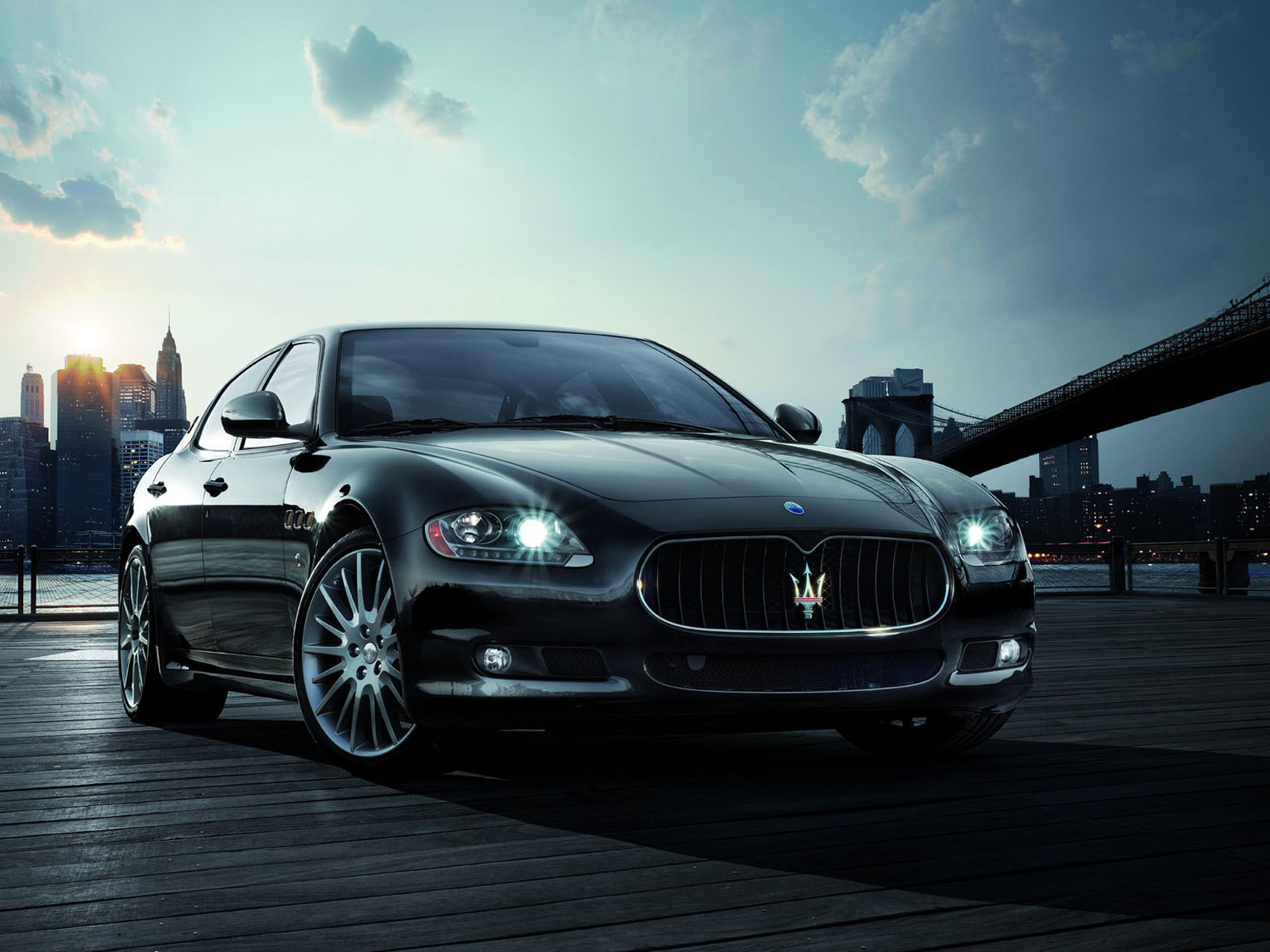 Description: A black masera parked on a wooden dock in front of a city skyline at night with the sun shining.