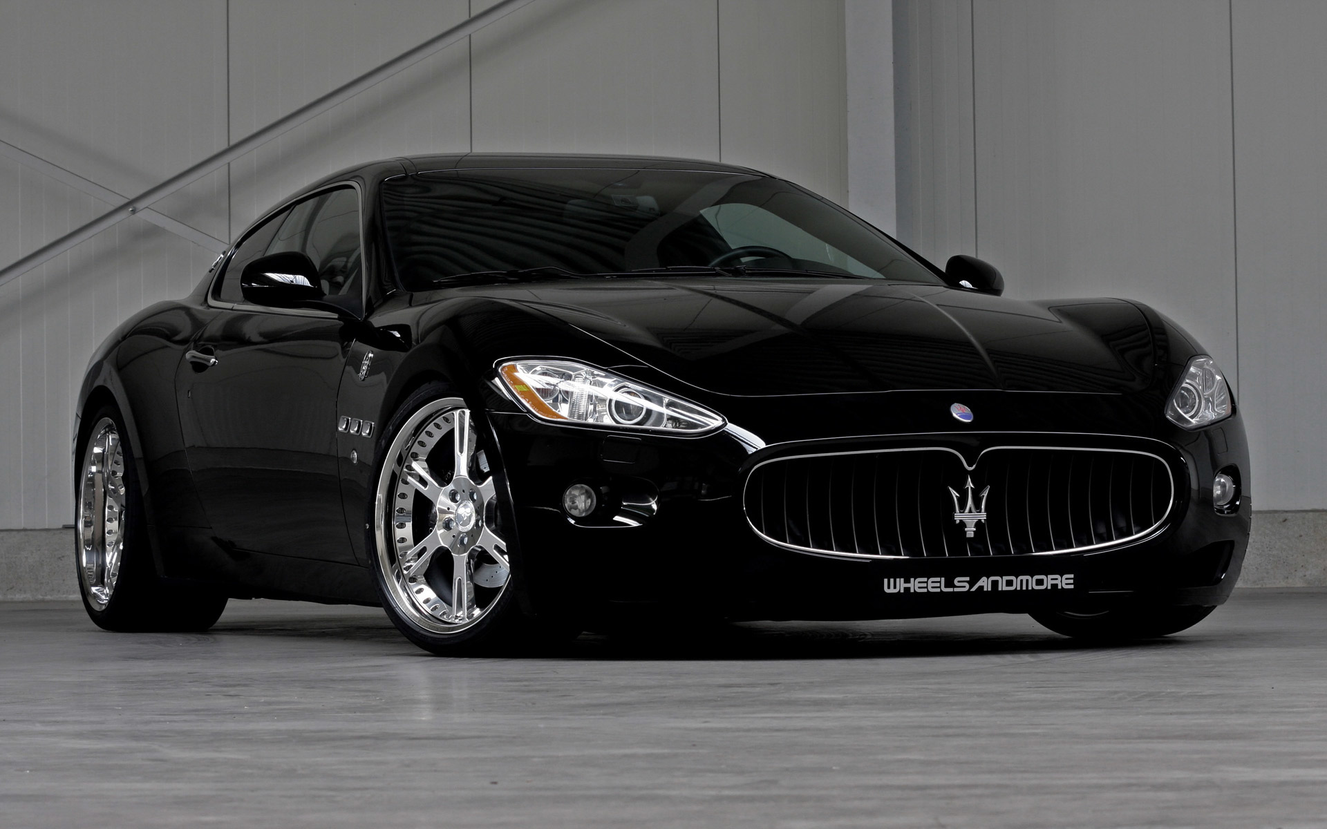 Description: A black masera parked in a garage next to a wall of windows and a door with a window frame.