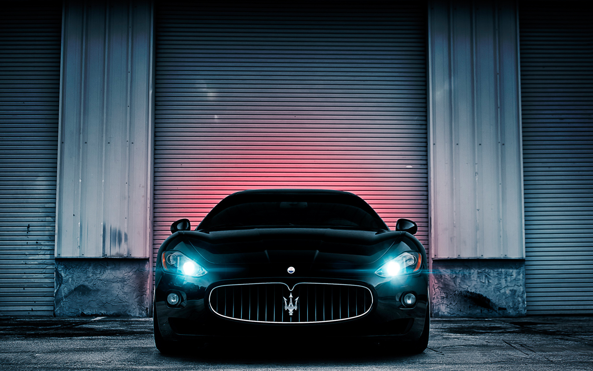 Description: A black masera parked in front of a garage door with a red light on it's headlight.