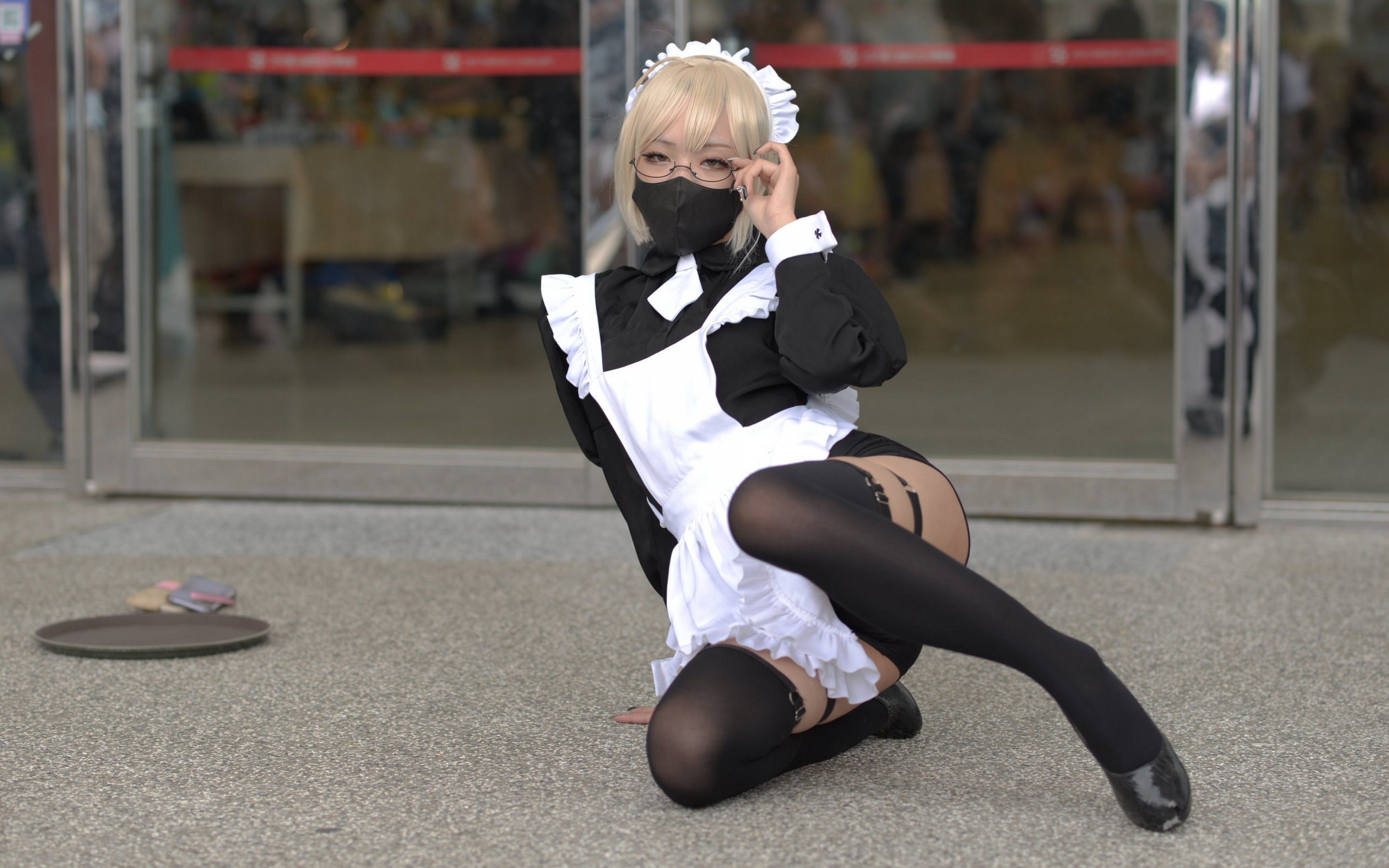 Description: A woman in a black and white outfit is sitting on the ground with her legs crossed and a black mask on her face.