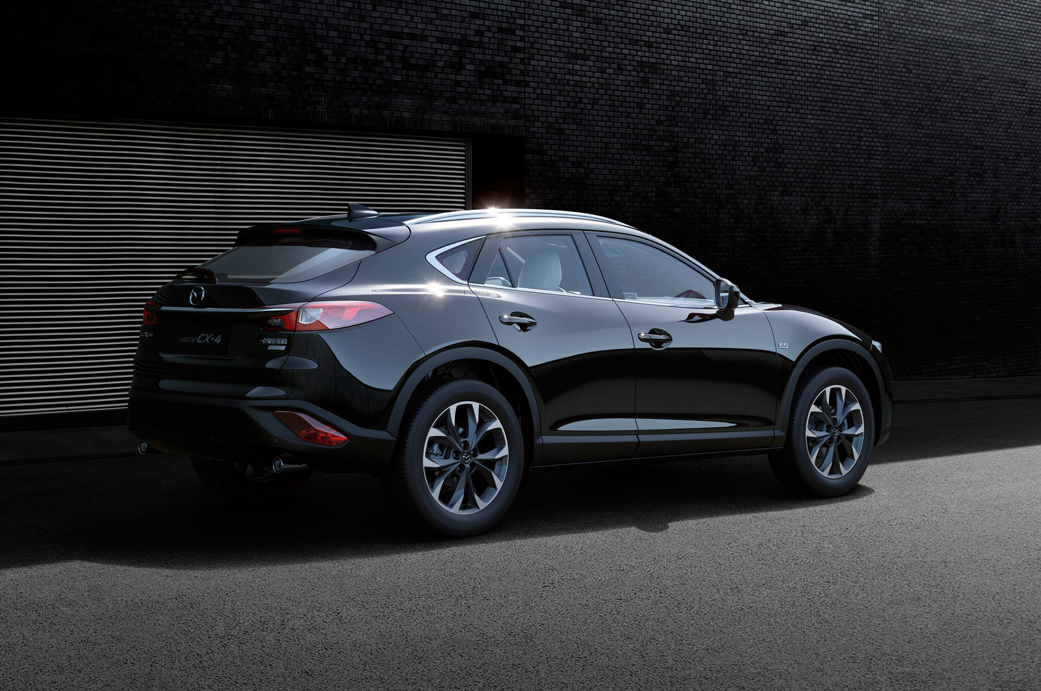 Description: A black mazda suv parked in a dark alley with a garage door open and a light on the back.