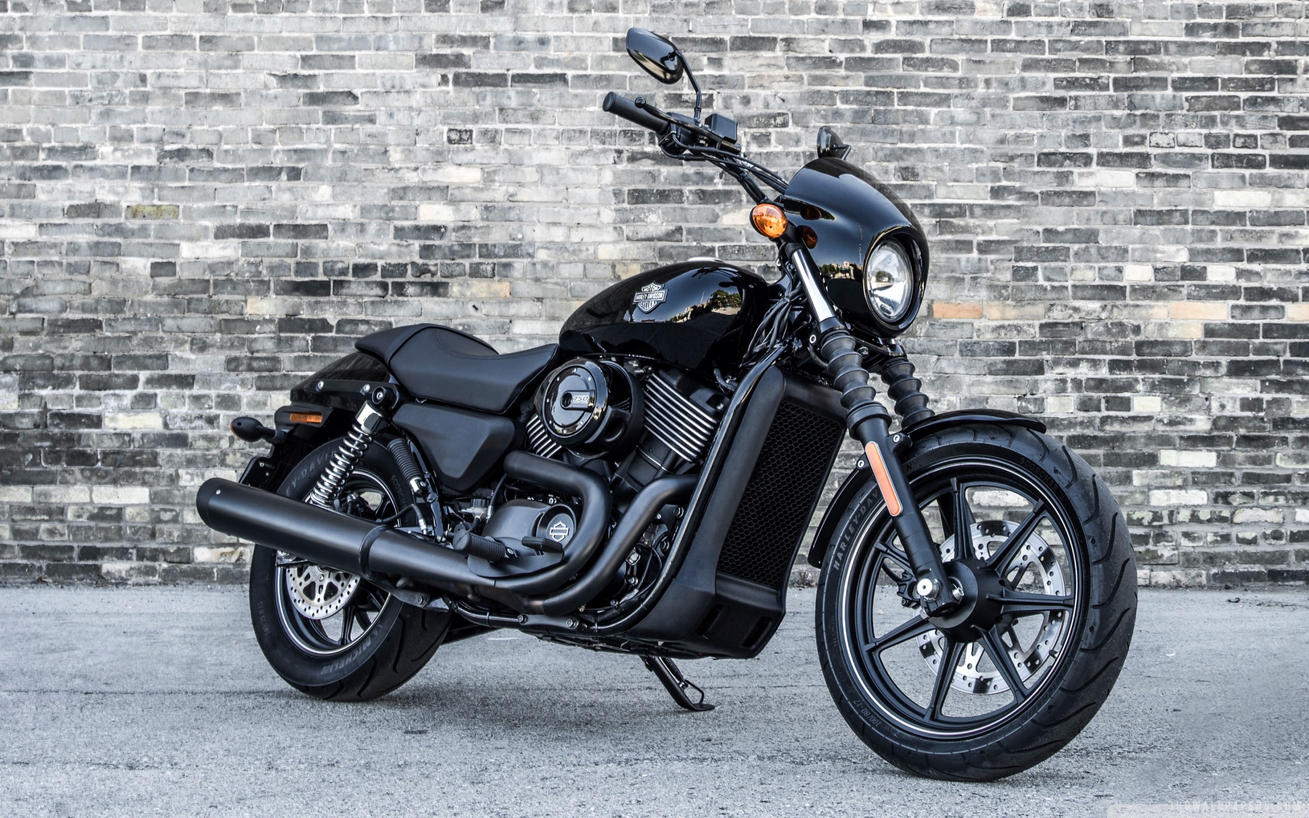 Description: A black motorcycle parked in front of a brick wall with a light on it's headlight and a black handlebar.