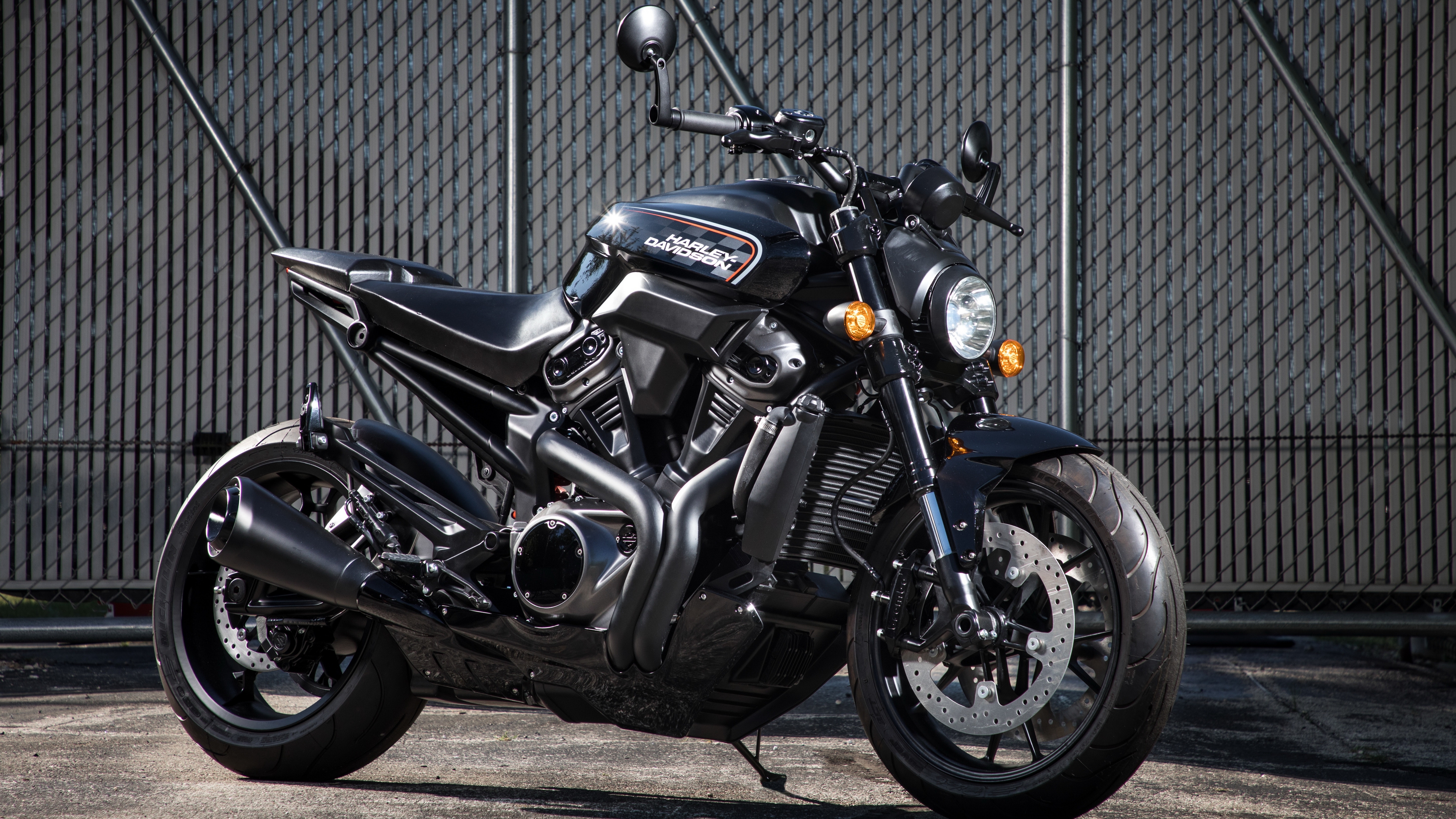 Description: A black motorcycle parked in front of a fence and a building with a chain link fence behind it and a chain link fence behind it.