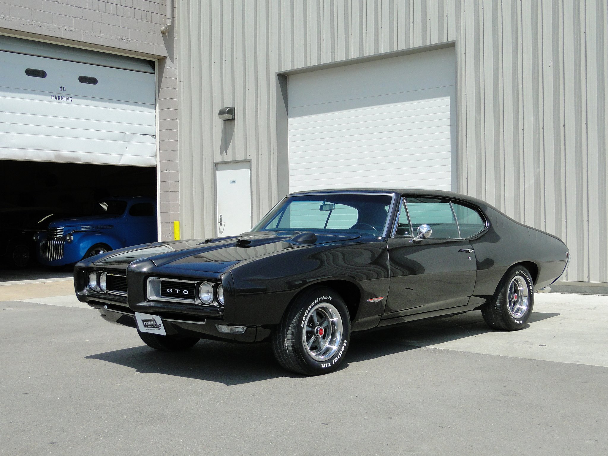 Description: A black muscle car parked in front of a garage door with a blue truck in the background and a garage door with a garage door open.