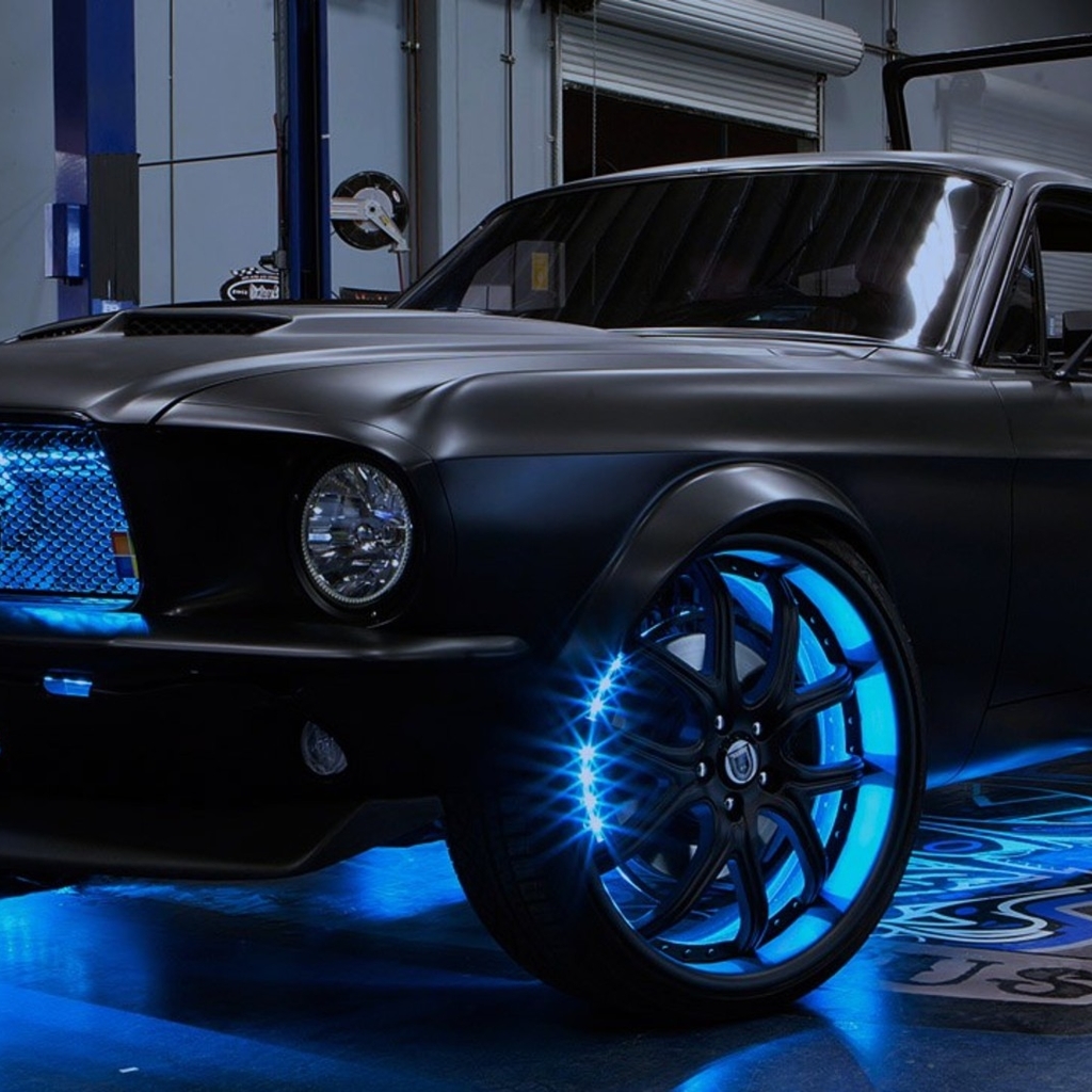 Description: A black mustang with blue lights on it's tires and a hood on it's hood is shown.