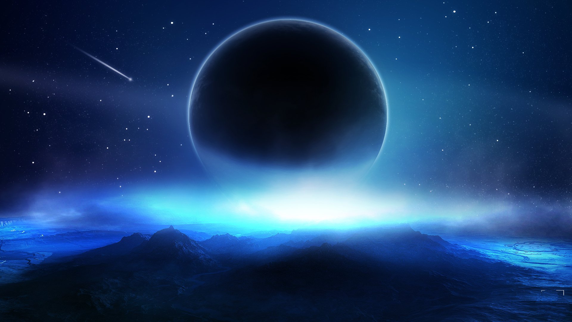 Description: A large black object in the sky with a bright light coming from it's center and a distant star in the background.