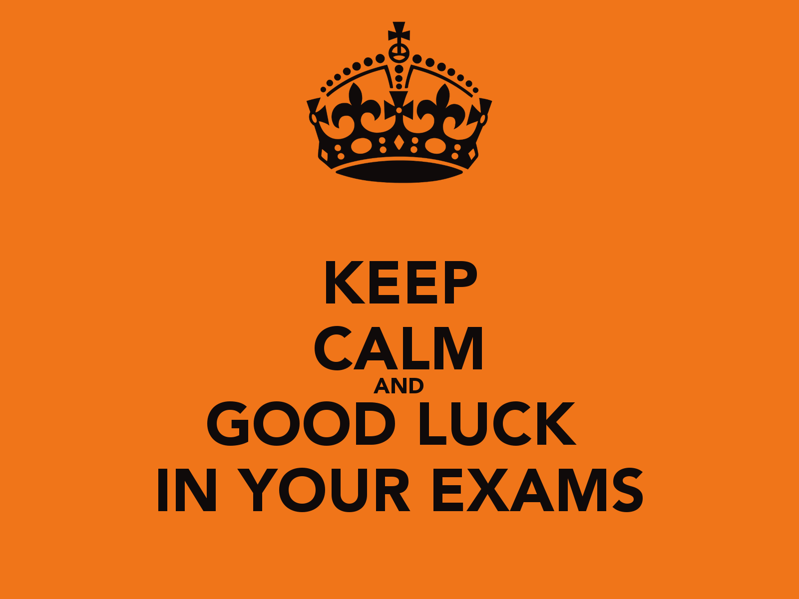 Description: A black and orange poster with a crown on it's head and words that read keep calm and good luck in your exam.