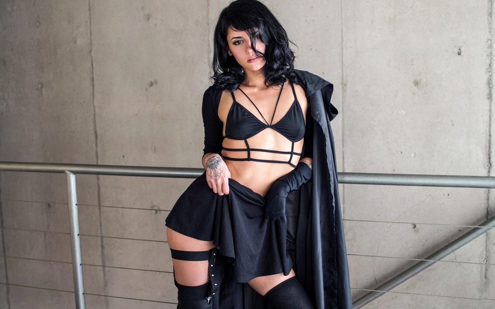 Description: A woman in a black outfit and a black cape posing for a picture with her hands on her hips.