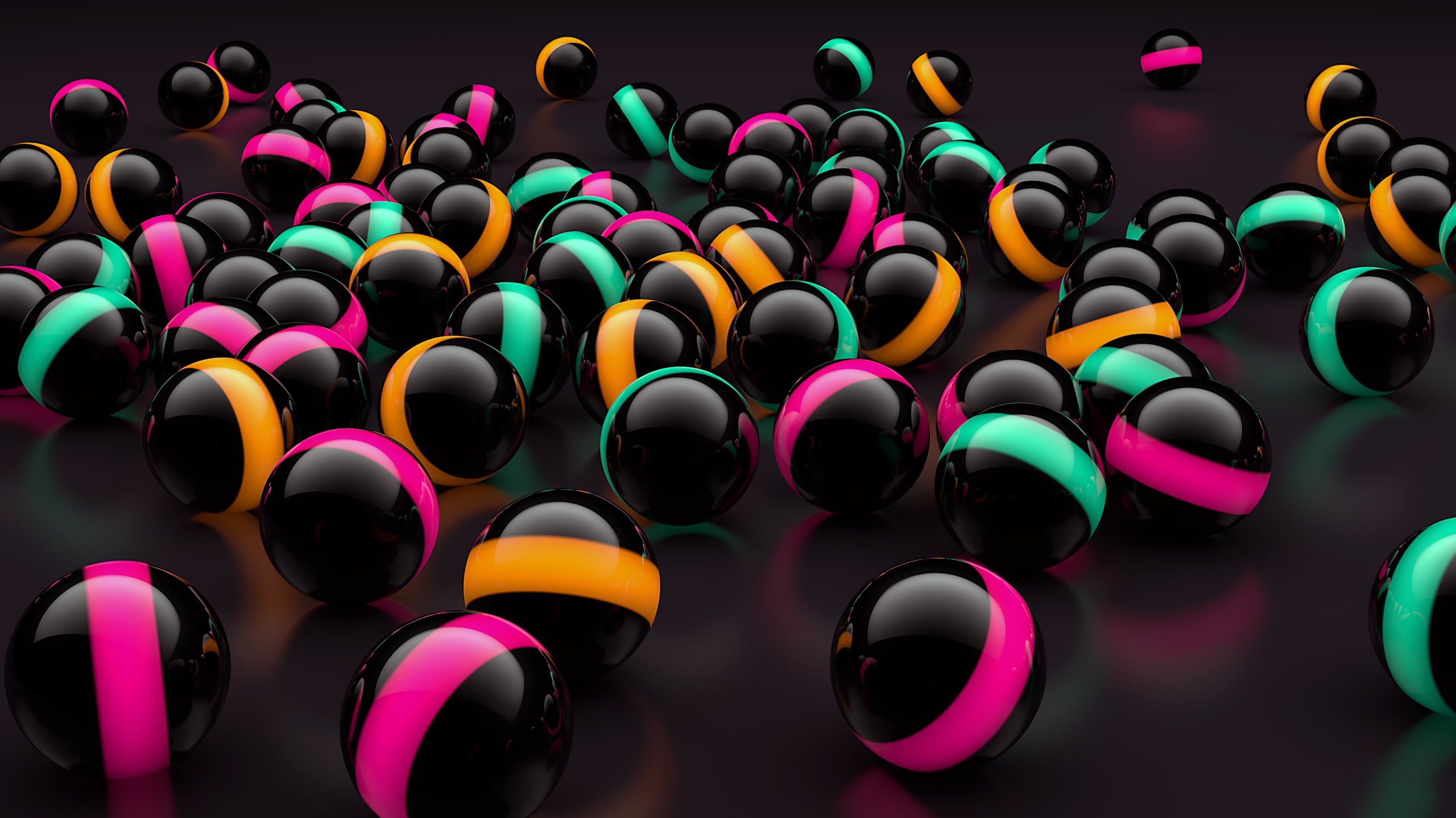 Description: A group of black and pink balls with a black background and a black background with a yellow and pink one.