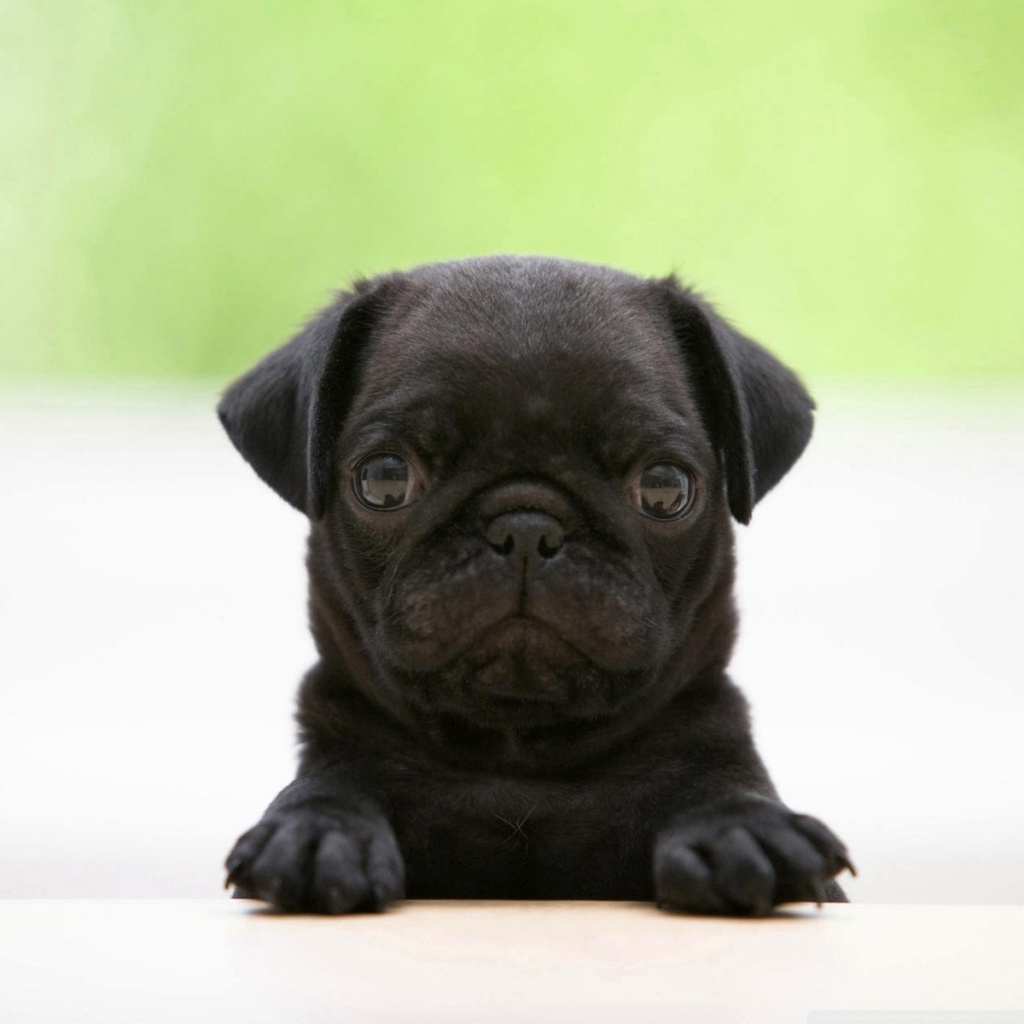 Description: A black pug puppy laying on the floor looking at the camera with a sad look on its face.