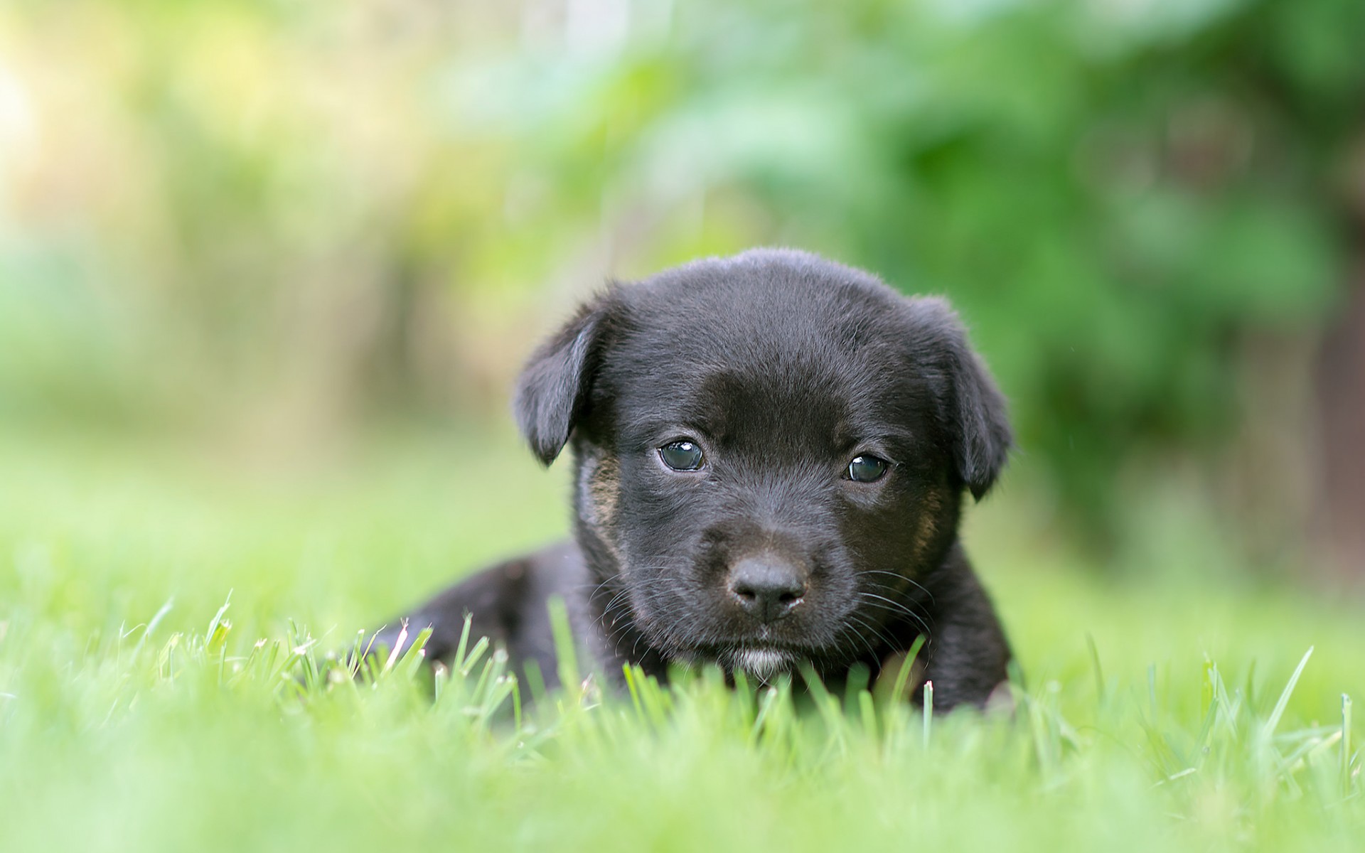 Description: A black puppy laying in the grass looking at the camera with a sad look on his face and eyes.