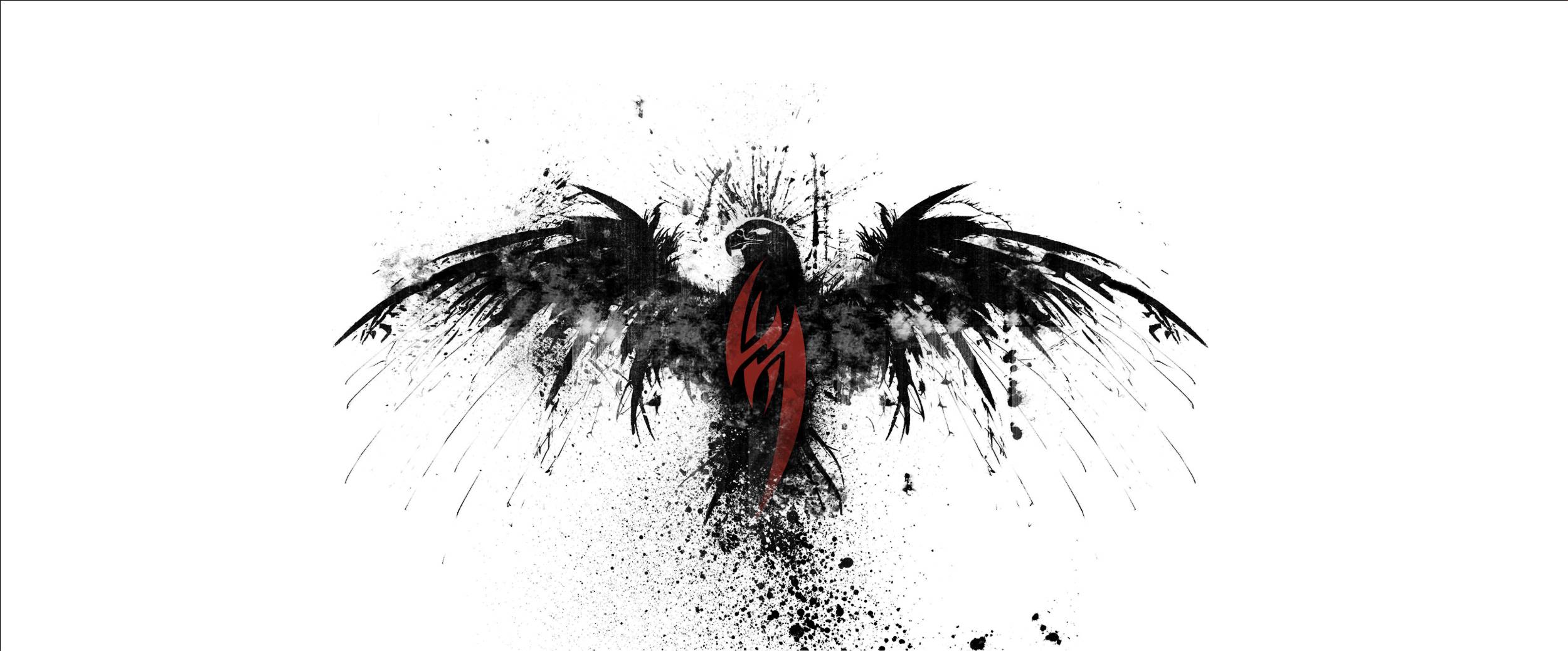 Description: A black and red bird with black wings on a white background with black splats and sprays.