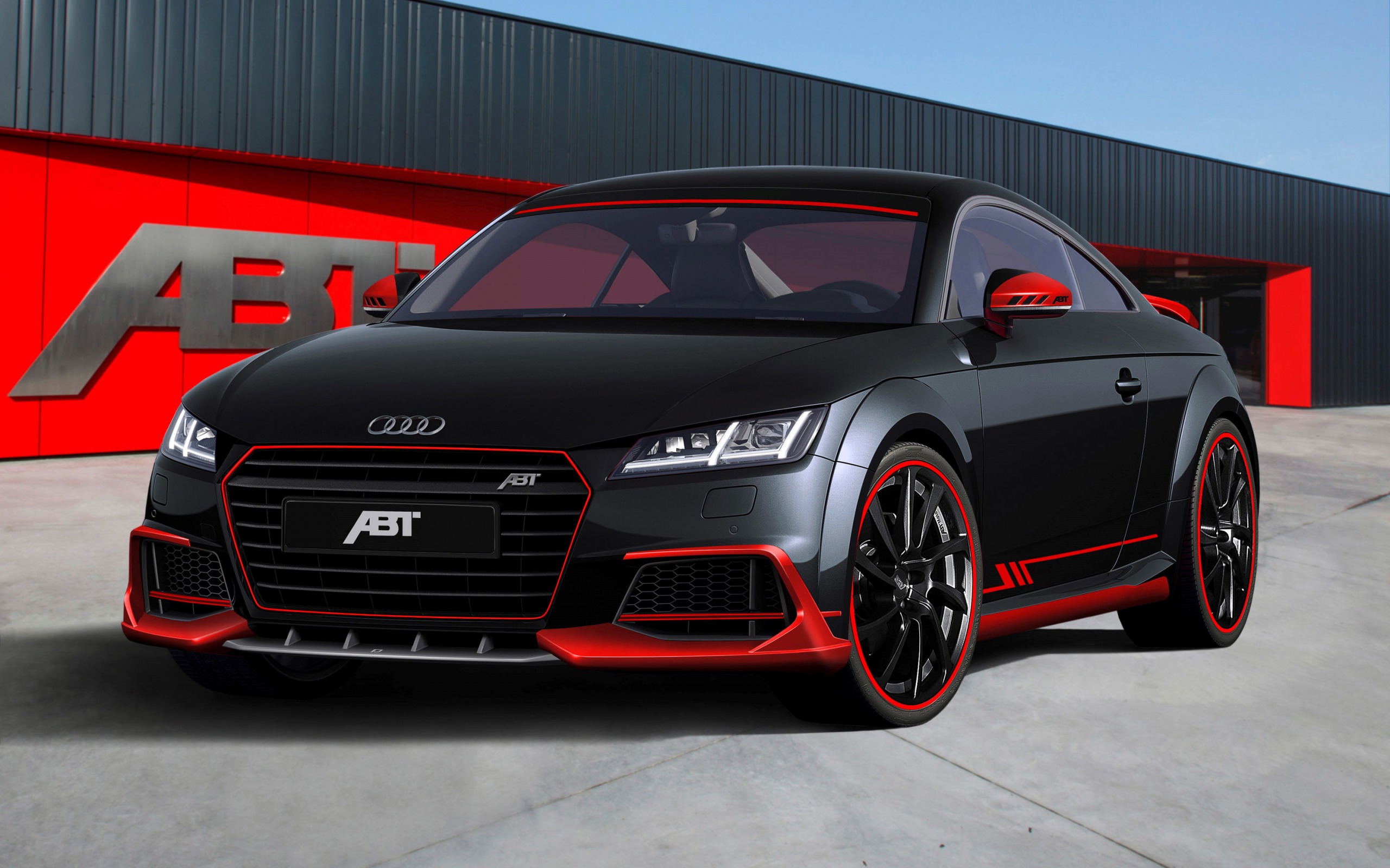 Description: A black and red car parked in front of a building with a red logo on it's side.