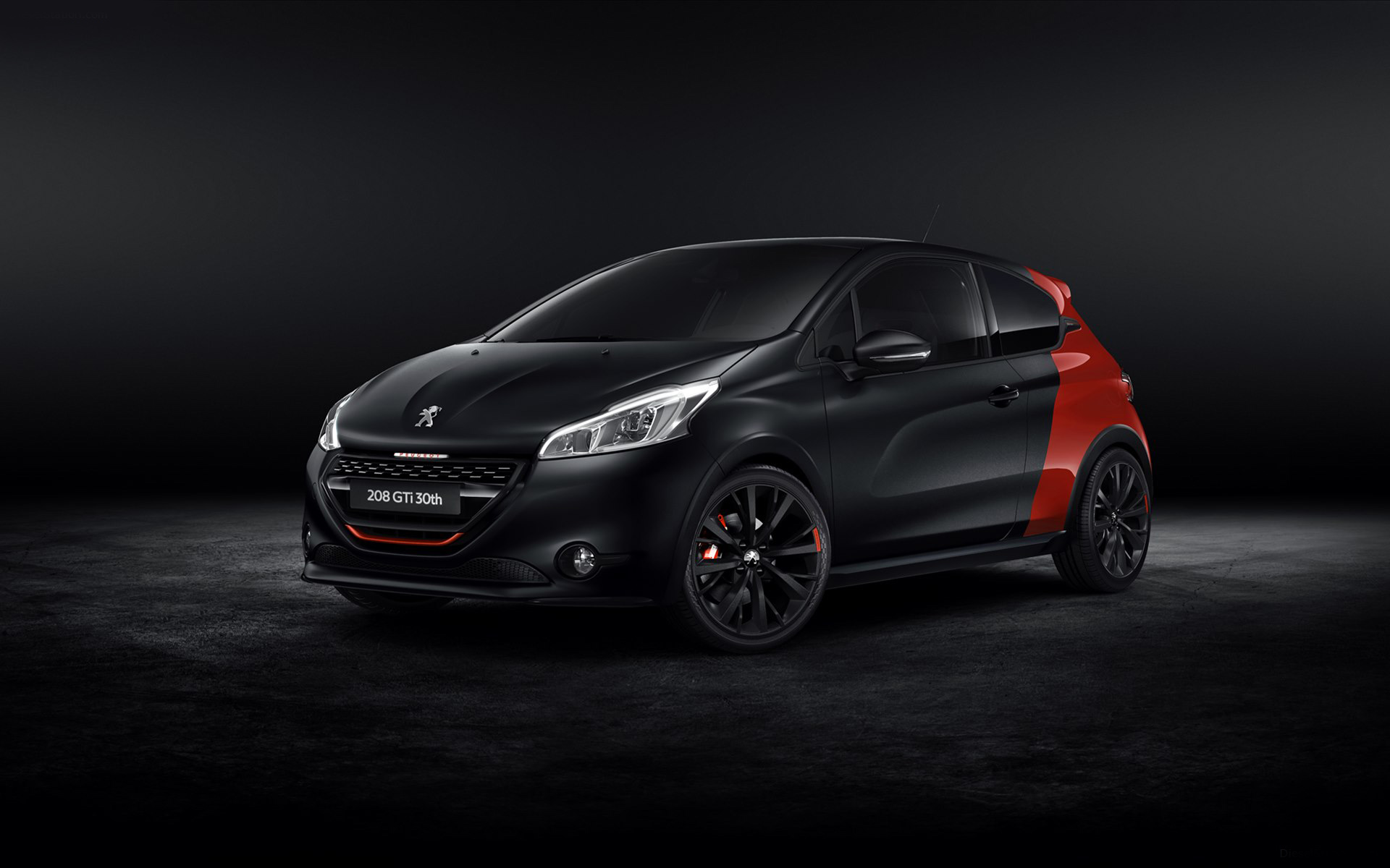 Description: A black and red car in a dark room with a black background and a red stripe on the side.
