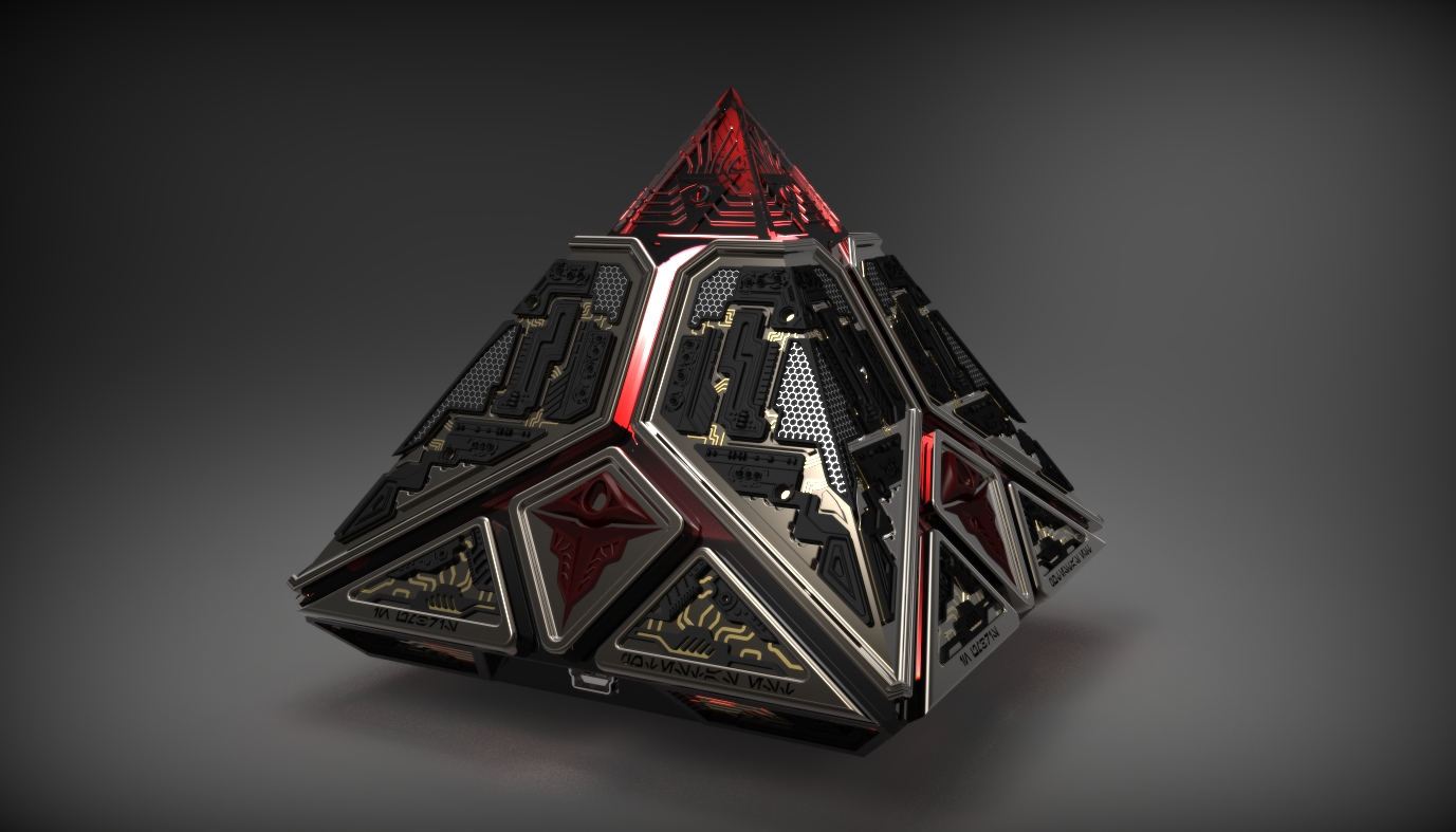 Description: A black and red object with a red triangle on top of it's sides and a red triangle on the bottom of it.