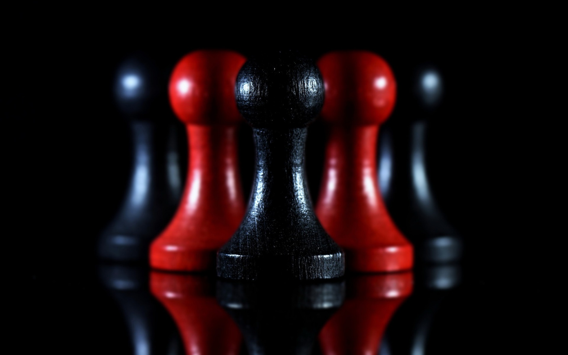 Description: A group of black and red pawns on a black surface with a reflection of them on the floor.