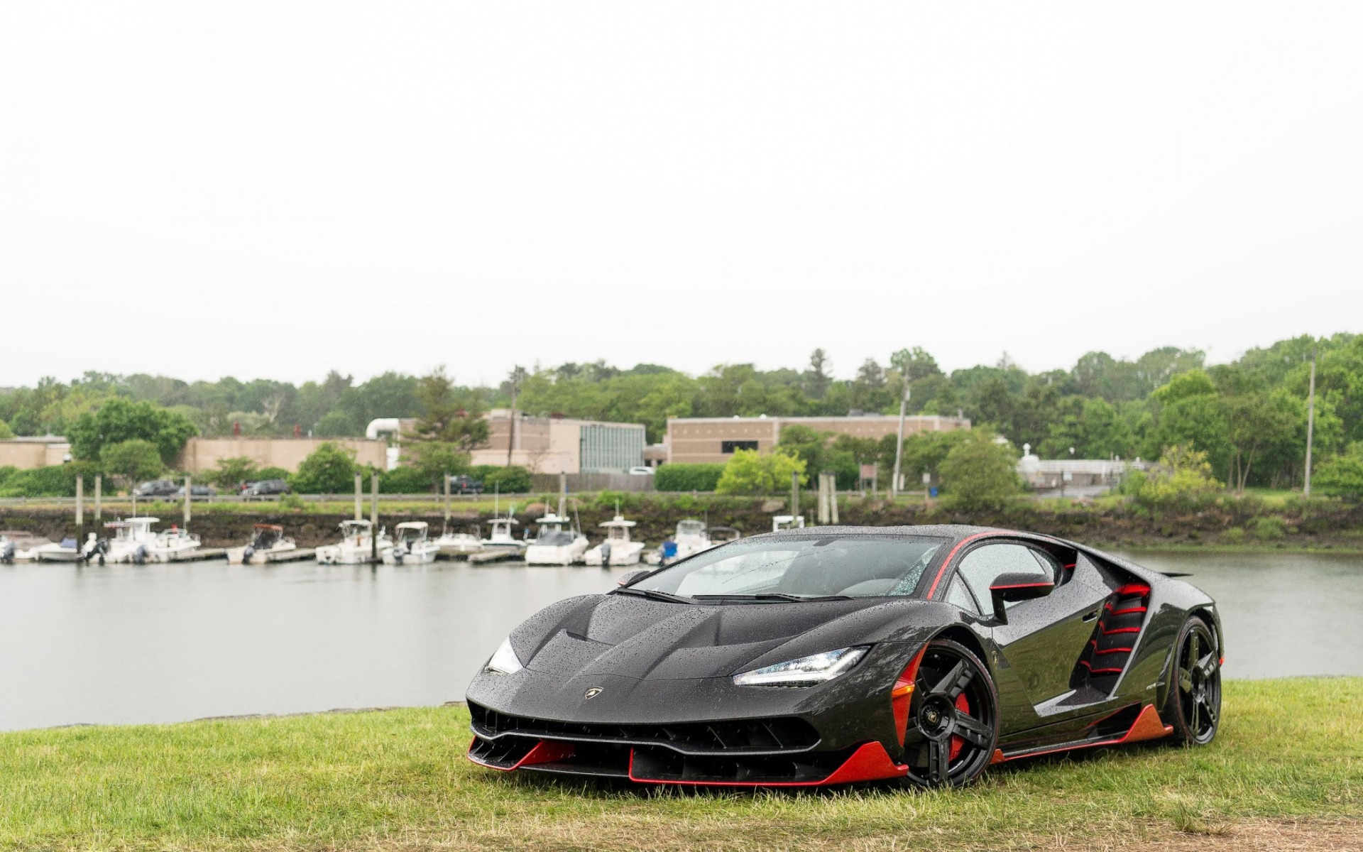 Description: A black and red sports car parked in a field next to a lake and boats in the water behind it.