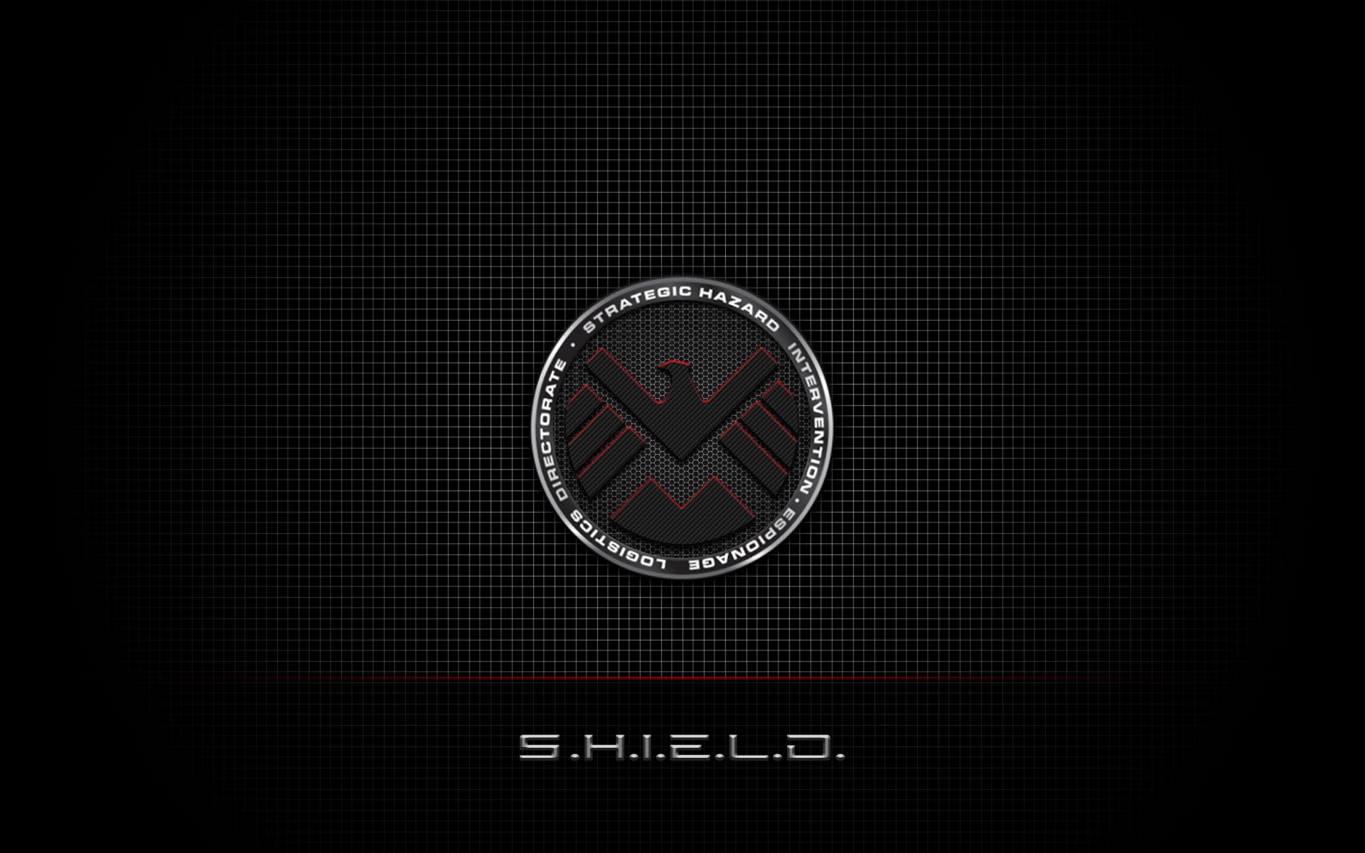 Description: A black and red wallpaper with a shield logo on it's side and the word shield on the bottom.