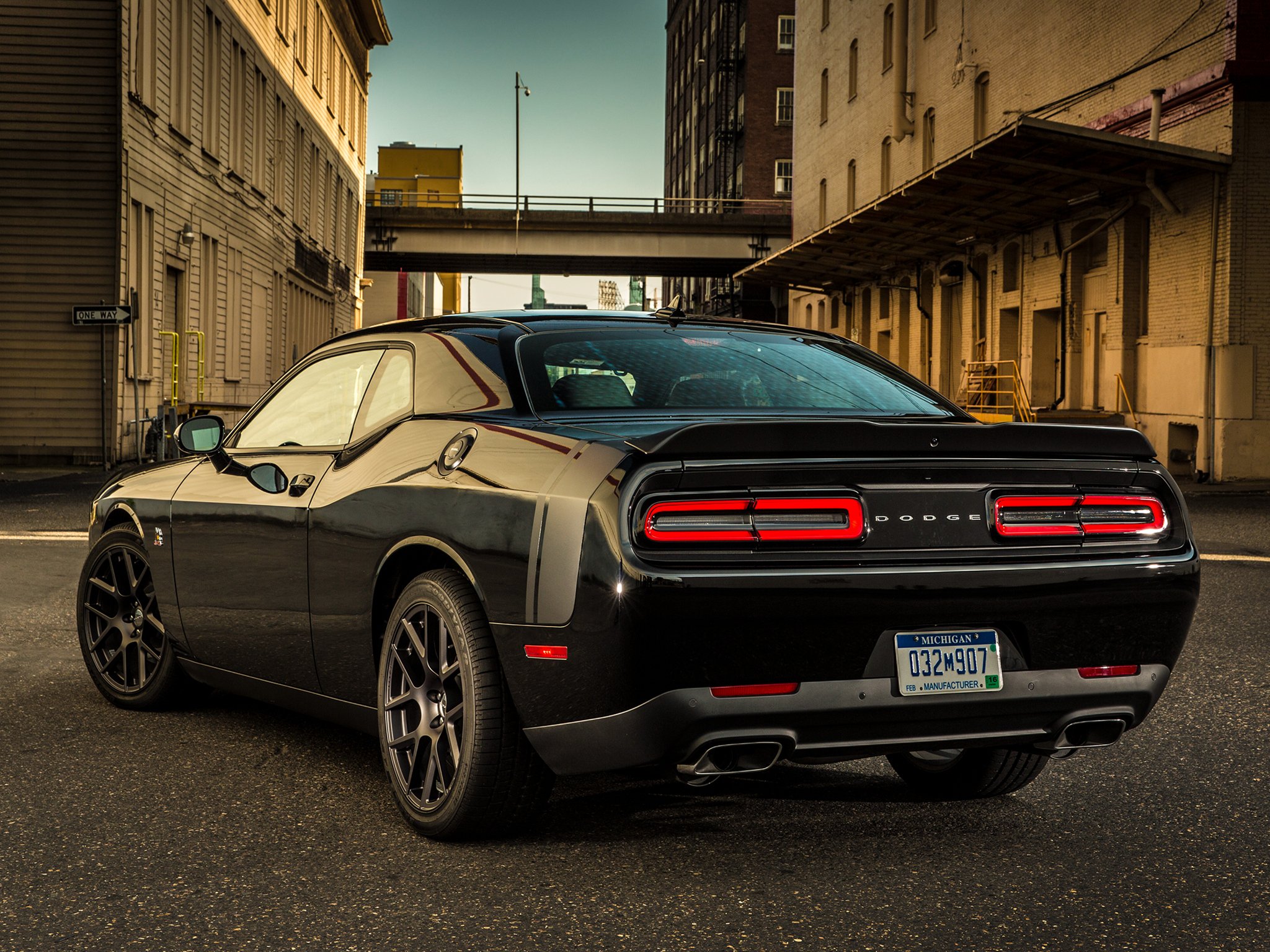 Description: A black sports car parked on the side of the road in a city street with a bridge in the background.
