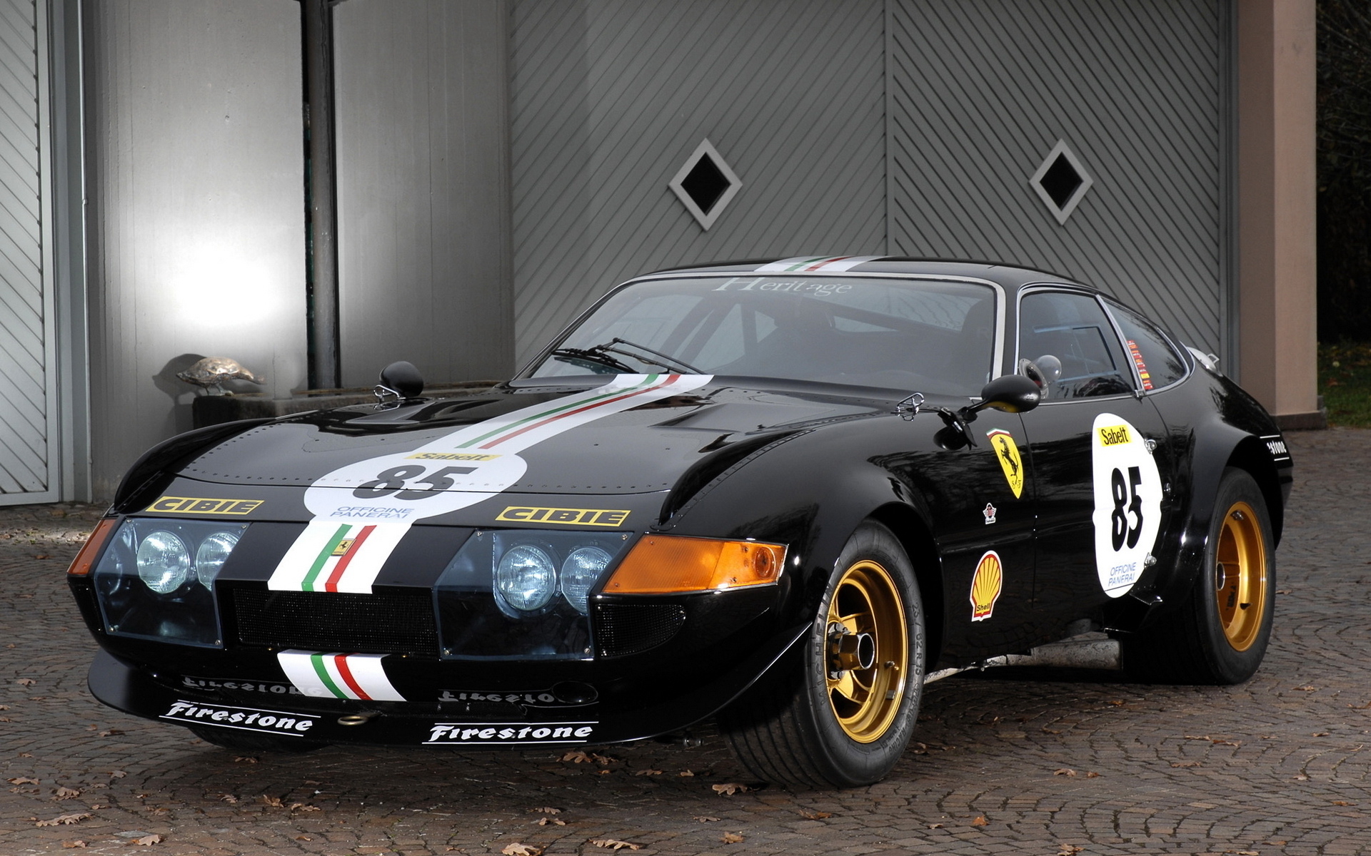 Description: A black sports car with a number on the front of it's body parked in front of a building.