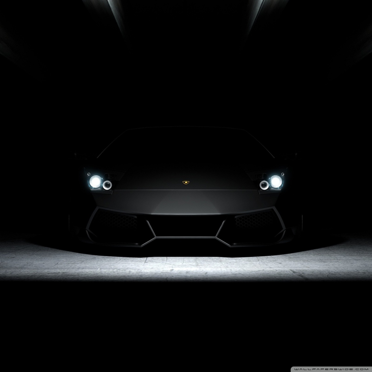 Description: A black sports car in a dark room with lights on it's headlightes and a black background.