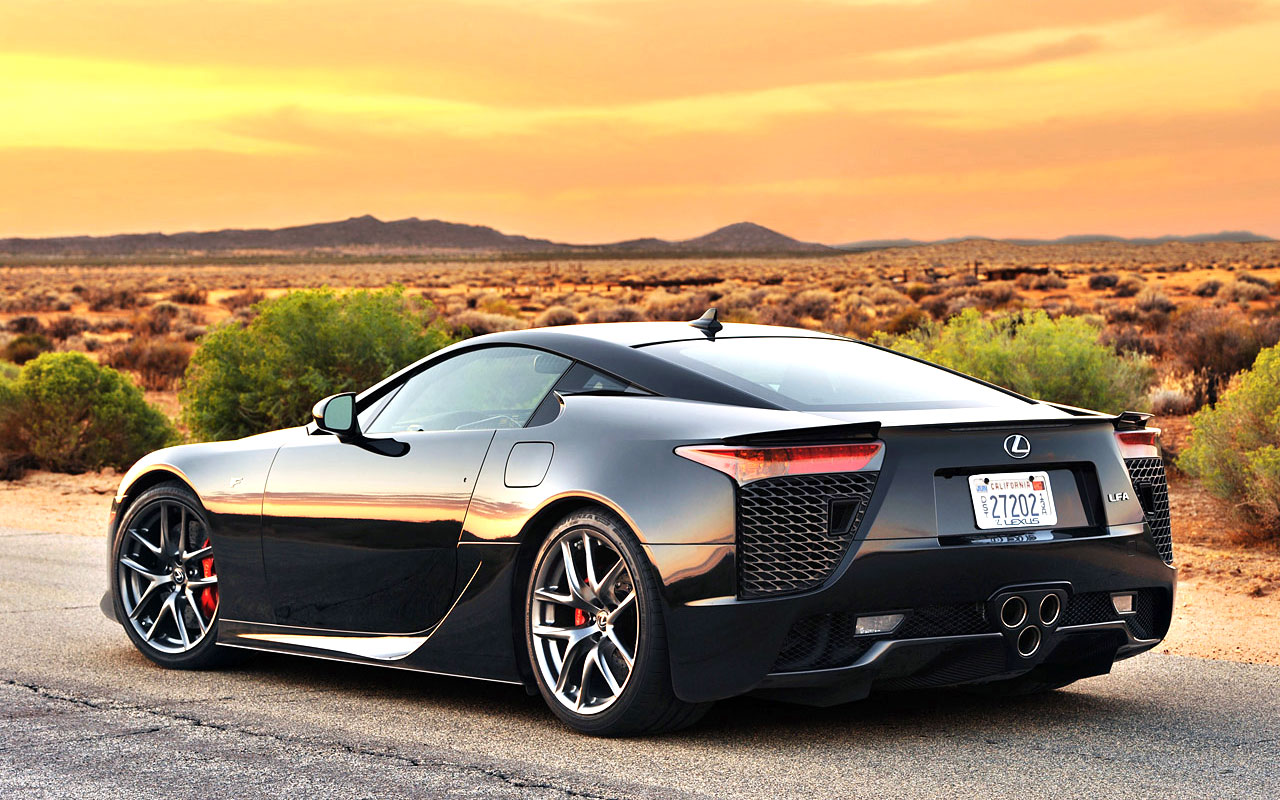 Description: A black sports car parked on the side of the road in the desert at sunset or dawn with a sky background.