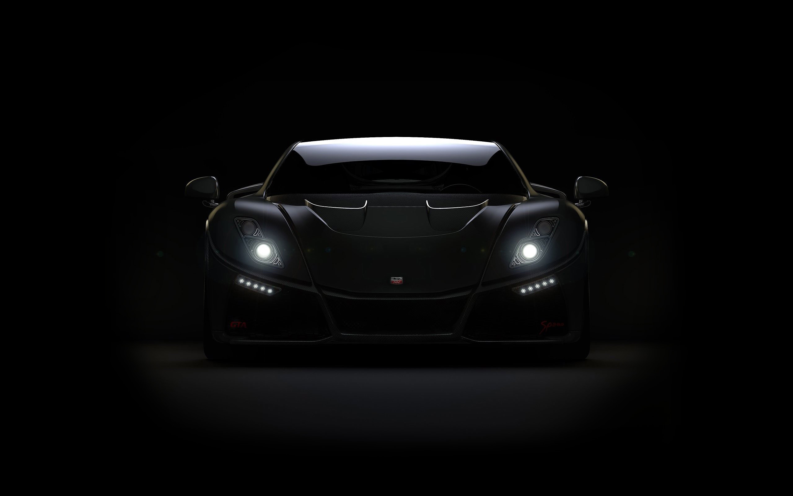Description: A black sports car in the dark with headlights on it's headlights and a black background.