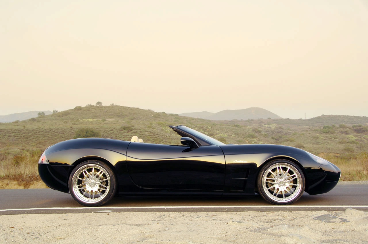 Description: A black sports car driving down a road near a hill side area with a mountain in the background and a sky filled with clouds.