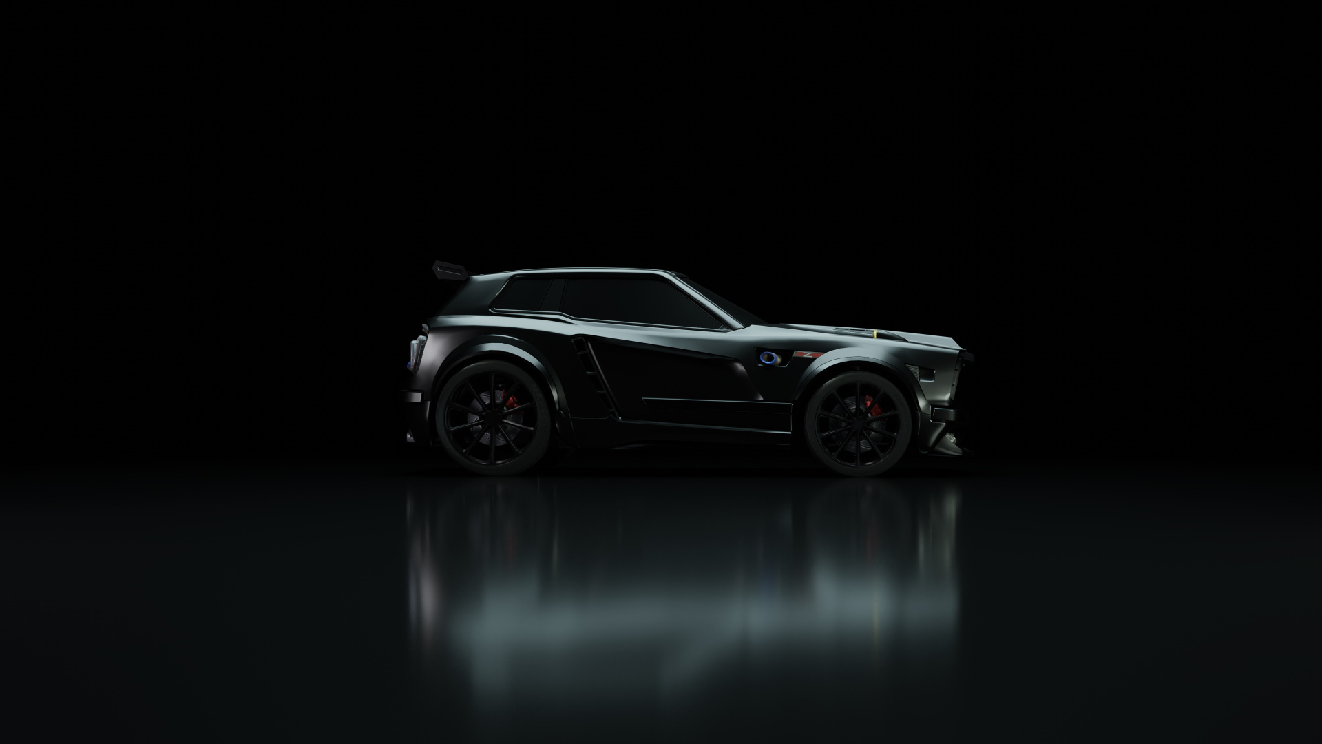 Description: A black sports car is shown in the dark room with its hood up and lights on the side of the car.
