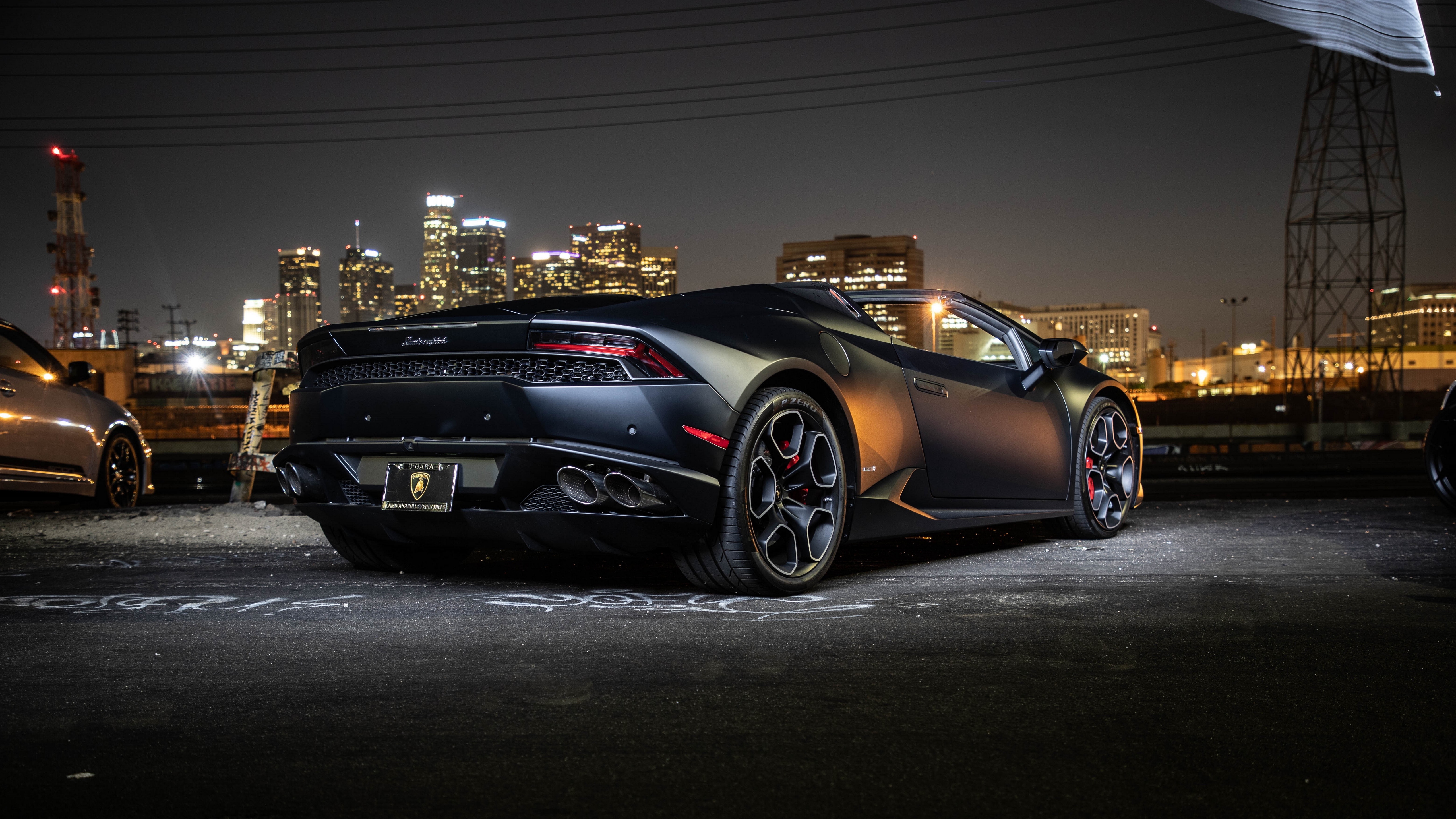 Description: A black sports car parked in a parking lot at night with a city skyline in the background at night.