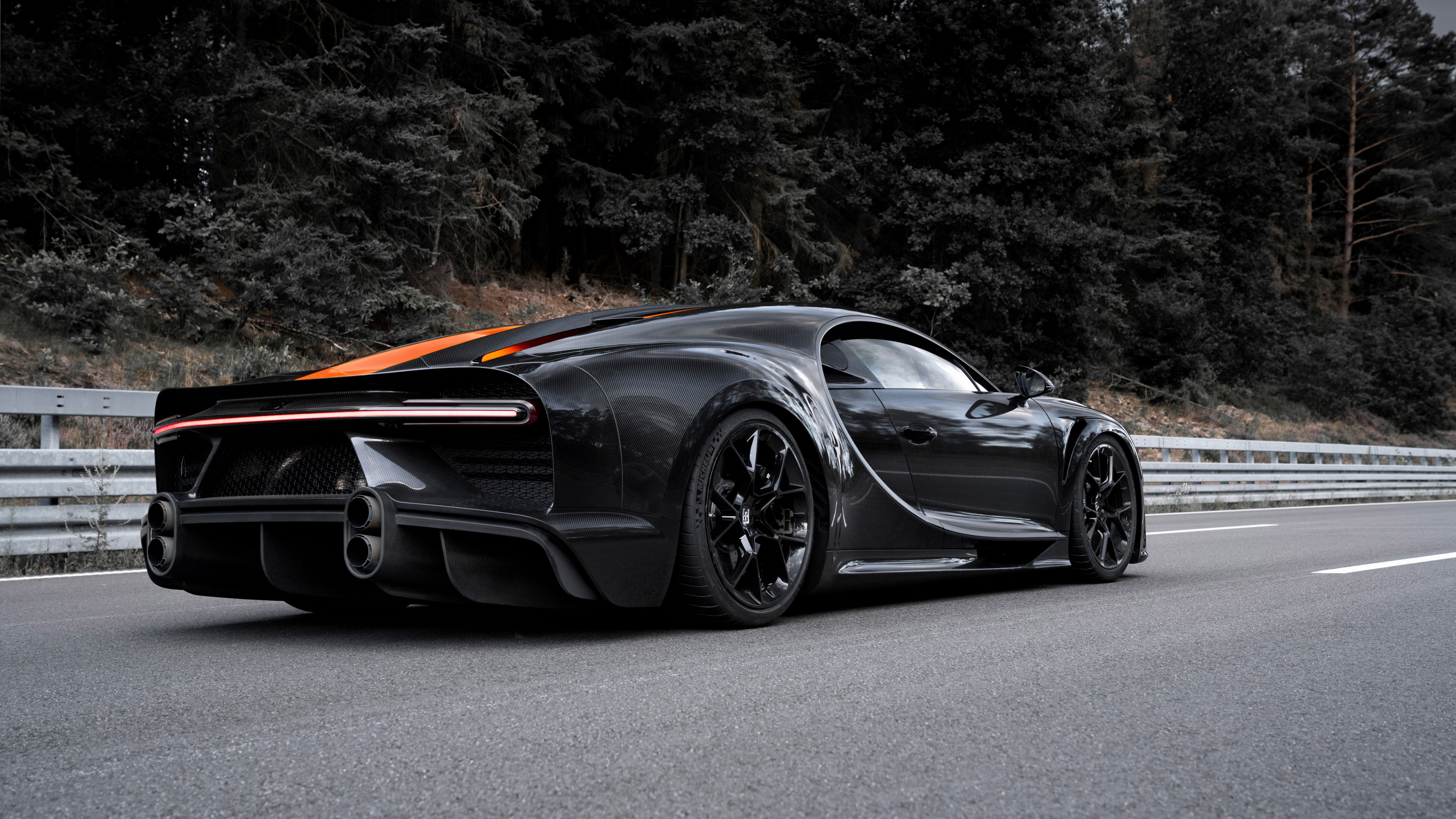 Description: A black sports car driving down a road next to a forest of trees and a fence with a wooden fence.