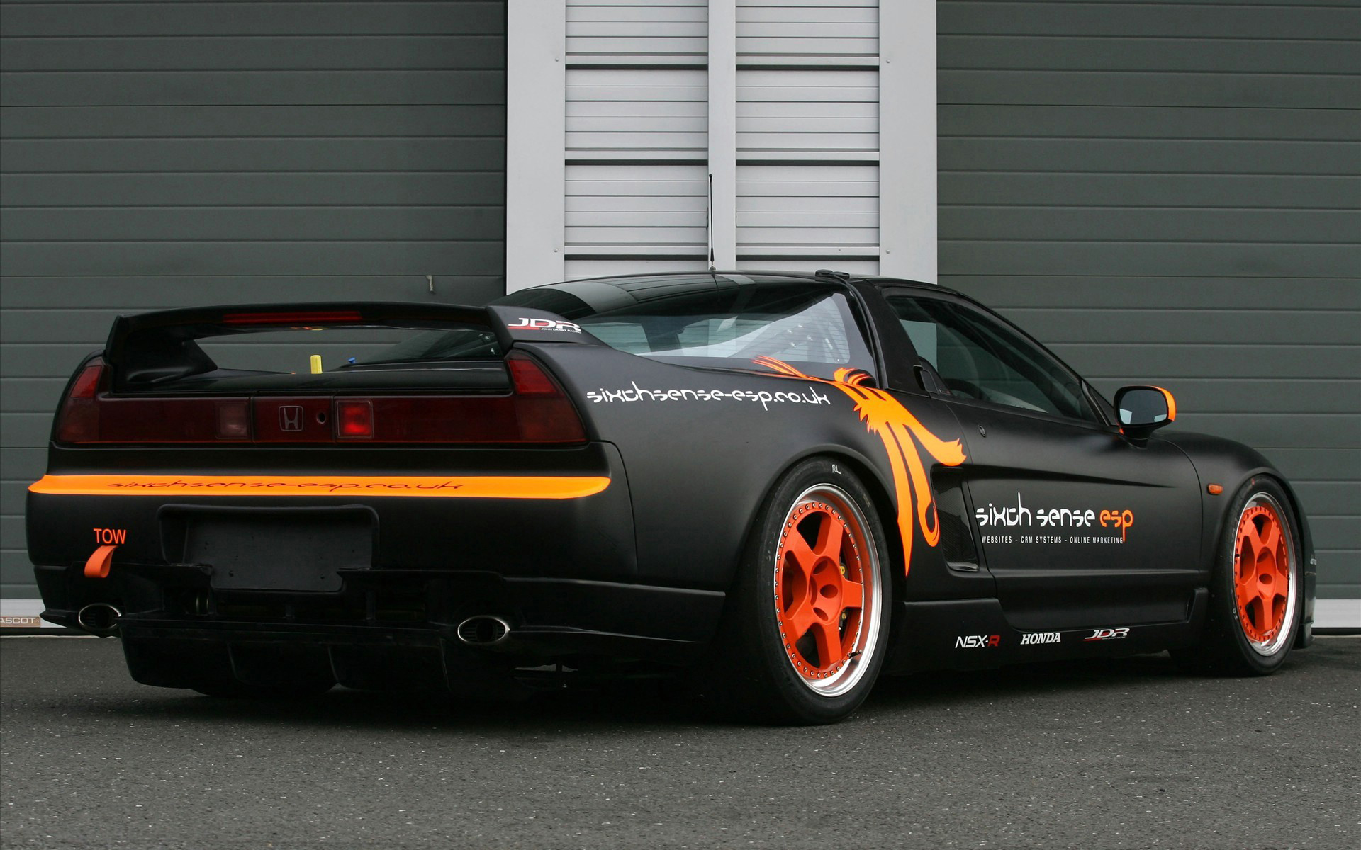 Description: A black sports car with orange flames on the rear end of it's body and tail lights on.