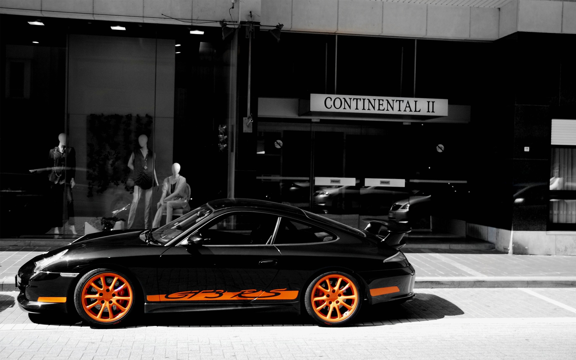 Description: A black sports car parked in front of a building with orange rims and a black top with a white sign.