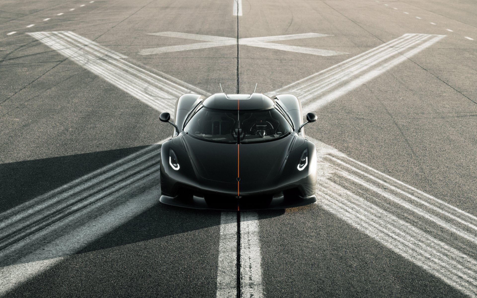 Description: A black sports car driving down a runway with a sky background and a line of white lines on the ground.