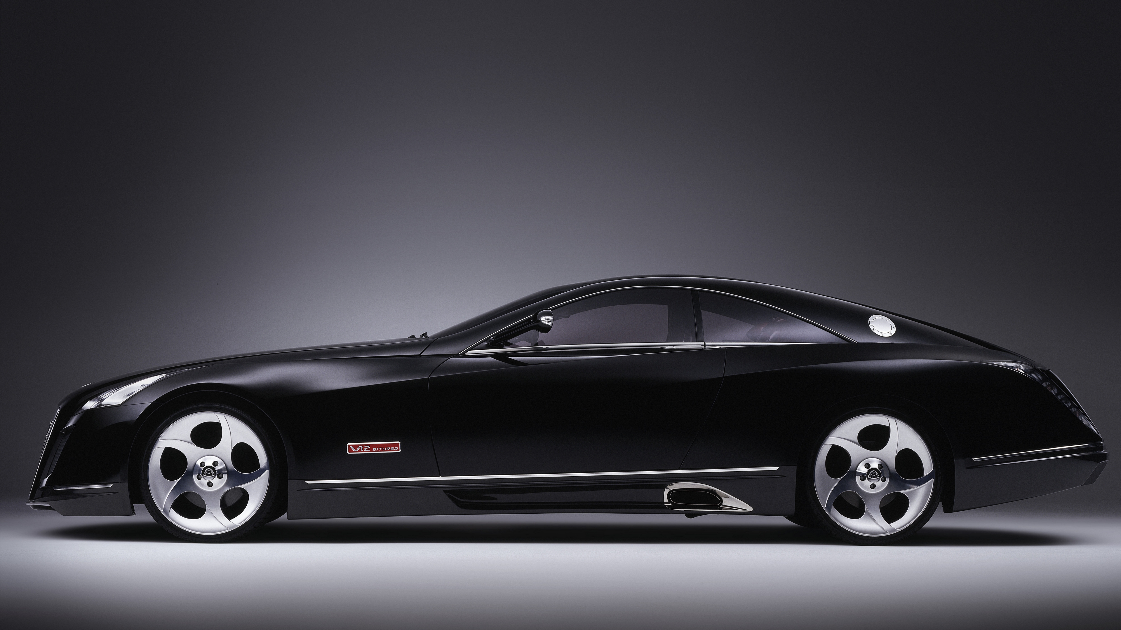 Description: A black sports car is shown in a studio setting with a gray background and a black background behind it.